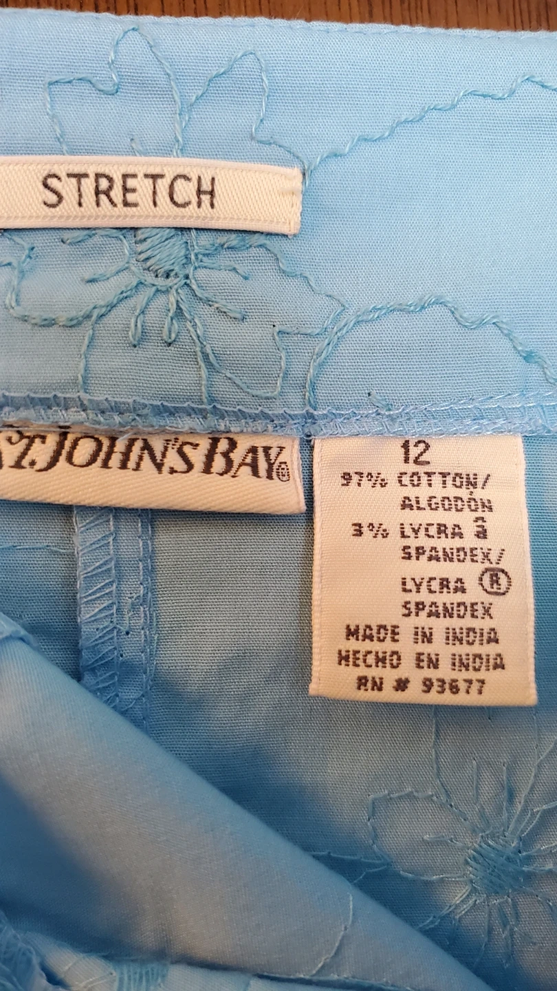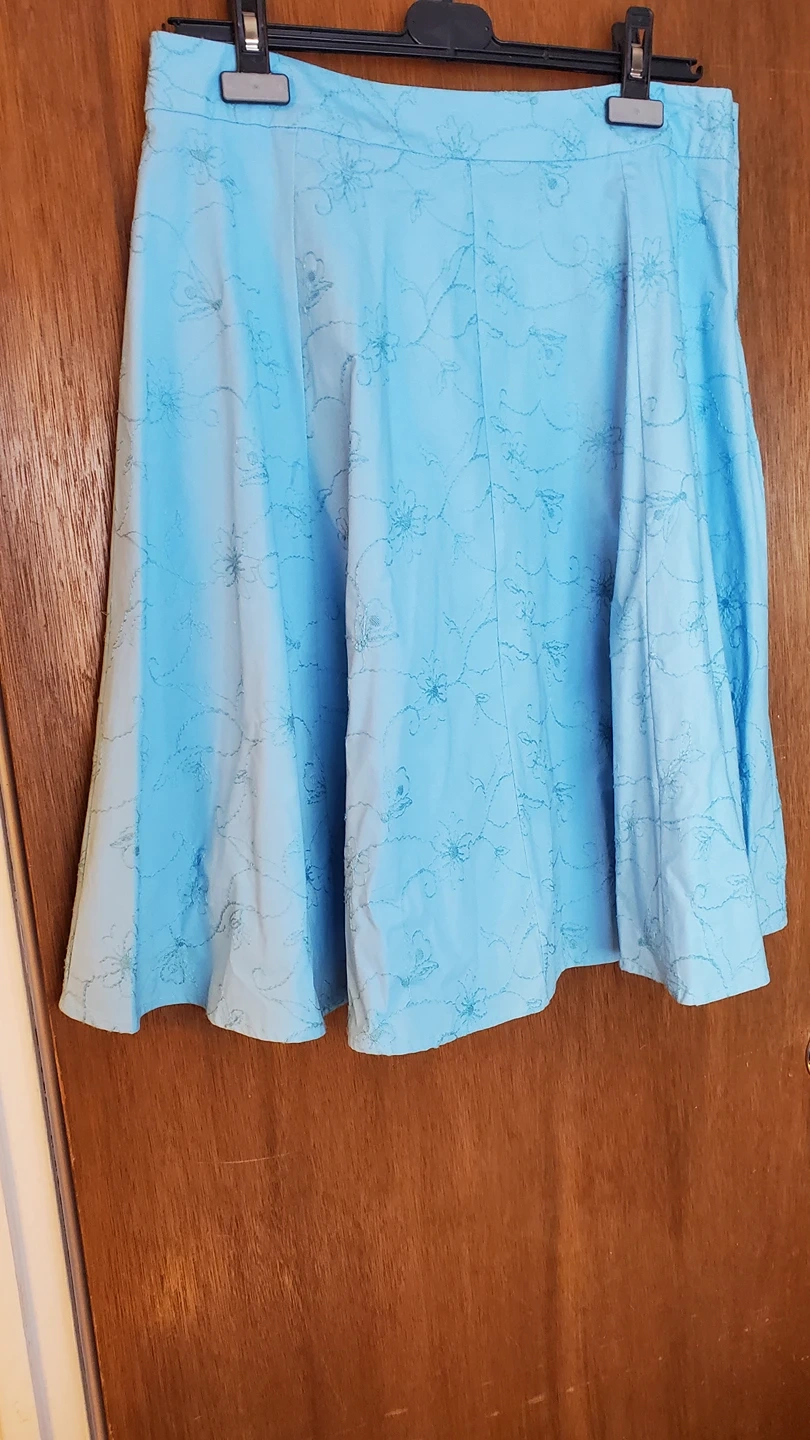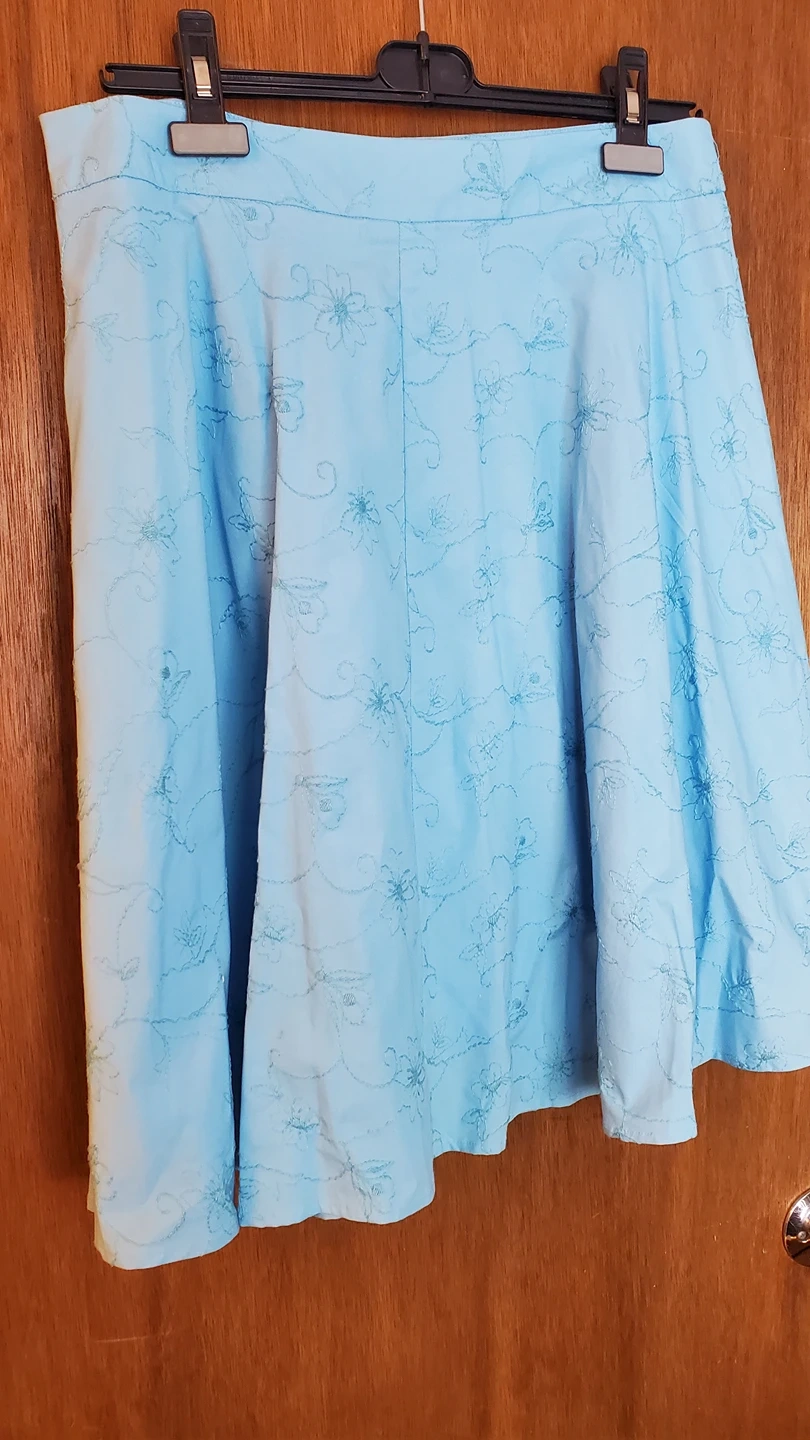 Pretty light blue skirt, with embroidery pattern. Has side Zipper, is nice and stretchy. Great for hot weather. Pickup Midtown Toronto Mt.Pleasant and Eglinton area.