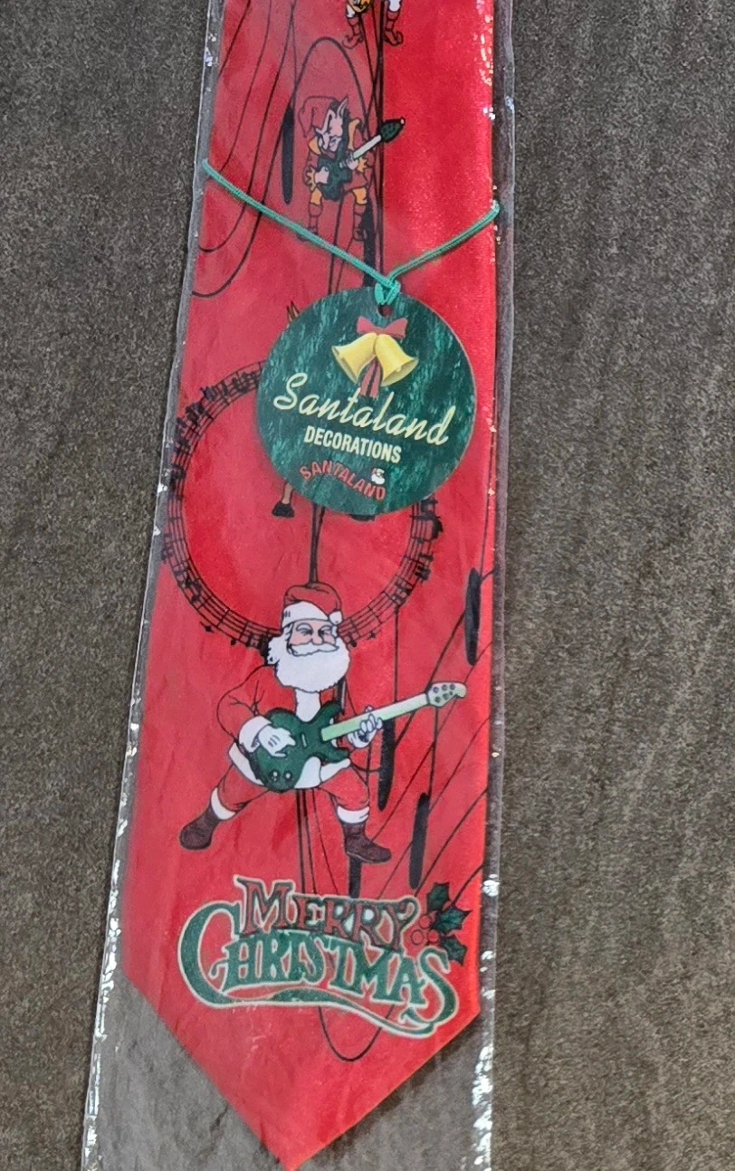 Brand new Santaland Christmas tie still in its original packaging. It's red with a fun Christmas design featuring Santa and other festive characters with a music theme. Dog friendly smoke free home.