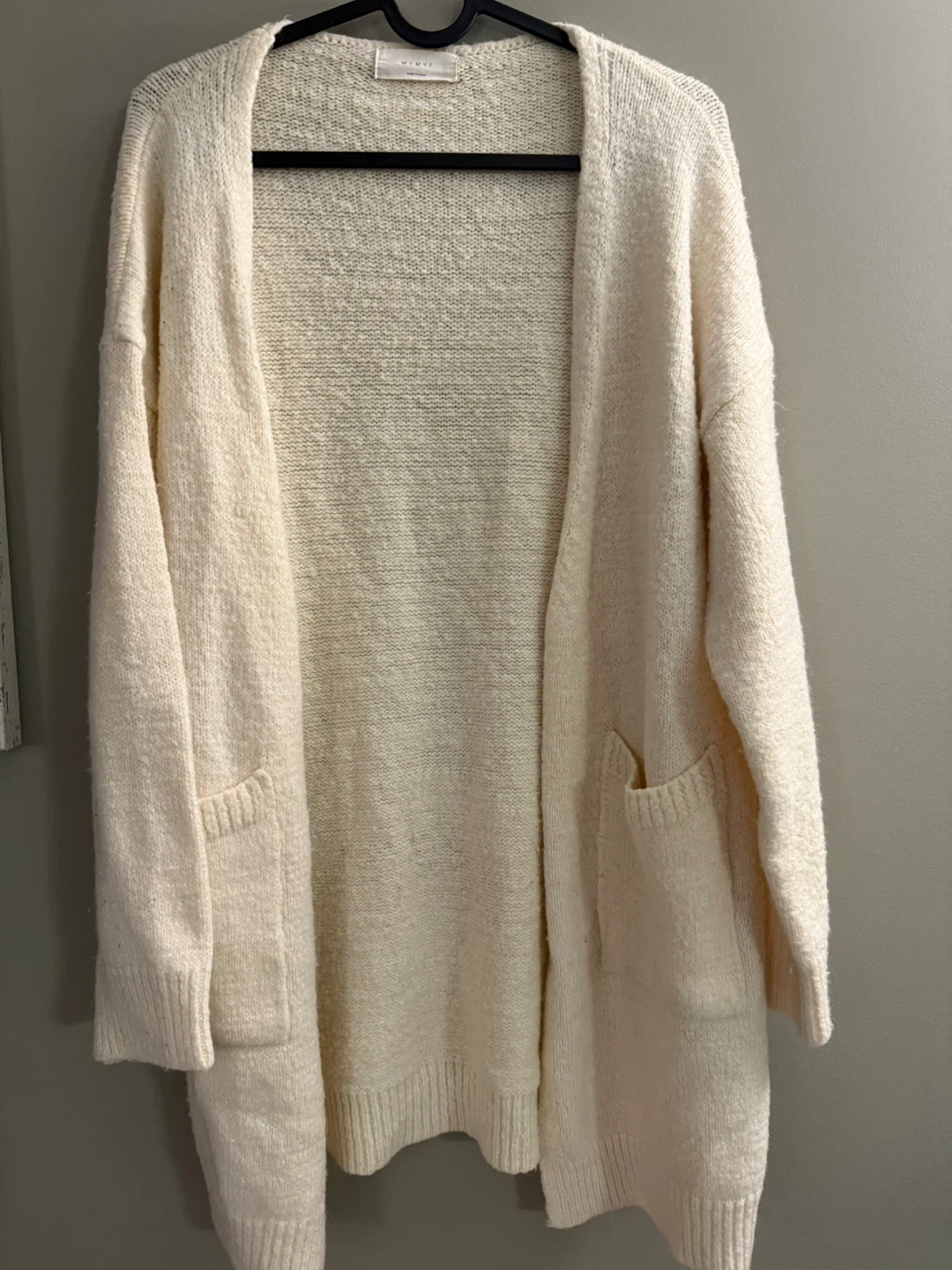 Here's a cozy cream-coloured knit cardigan from MYMYT! It's in great condition and ready to keep you warm. It features a relaxed, open-front design with handy pockets. Perfect for layering on chilly days!