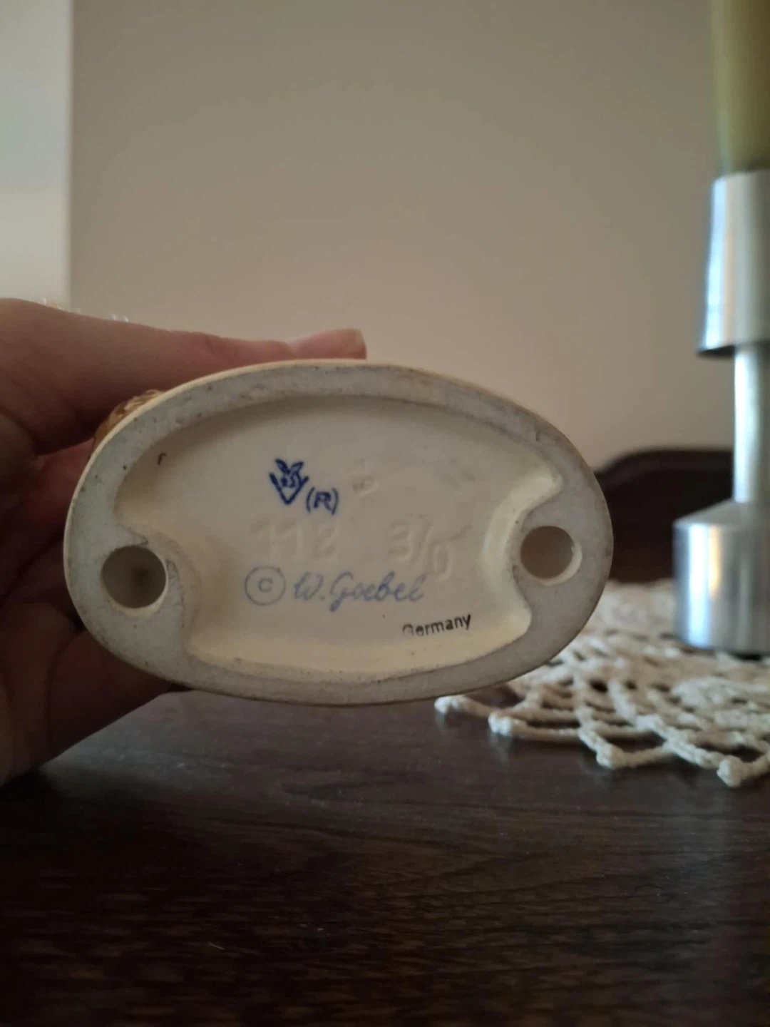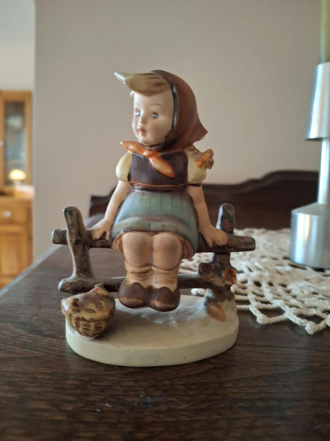 This is a charming vintage Goebel Hummel figurine. It's in great shape and features a sweet girl on a fence with a basket. The bottom shows the Goebel mark and "Germany". It's a lovely piece for any collector!
