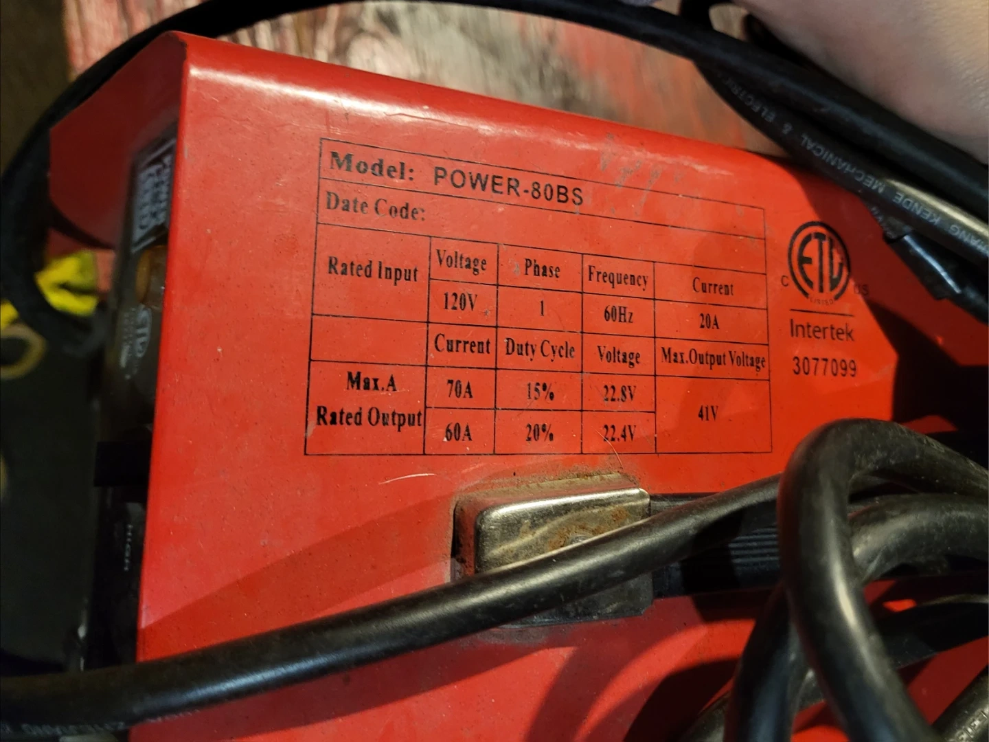 Selling a Power Fist POWER-80BS welder. It has a high/low switch and an on/off switch. The rated input is 120V, 1 phase, 60Hz, and 20A. The max output is 70A at 15% duty cycle, 22.8V. Rated output is 60A at 20% duty cycle, 22.4V and 41V