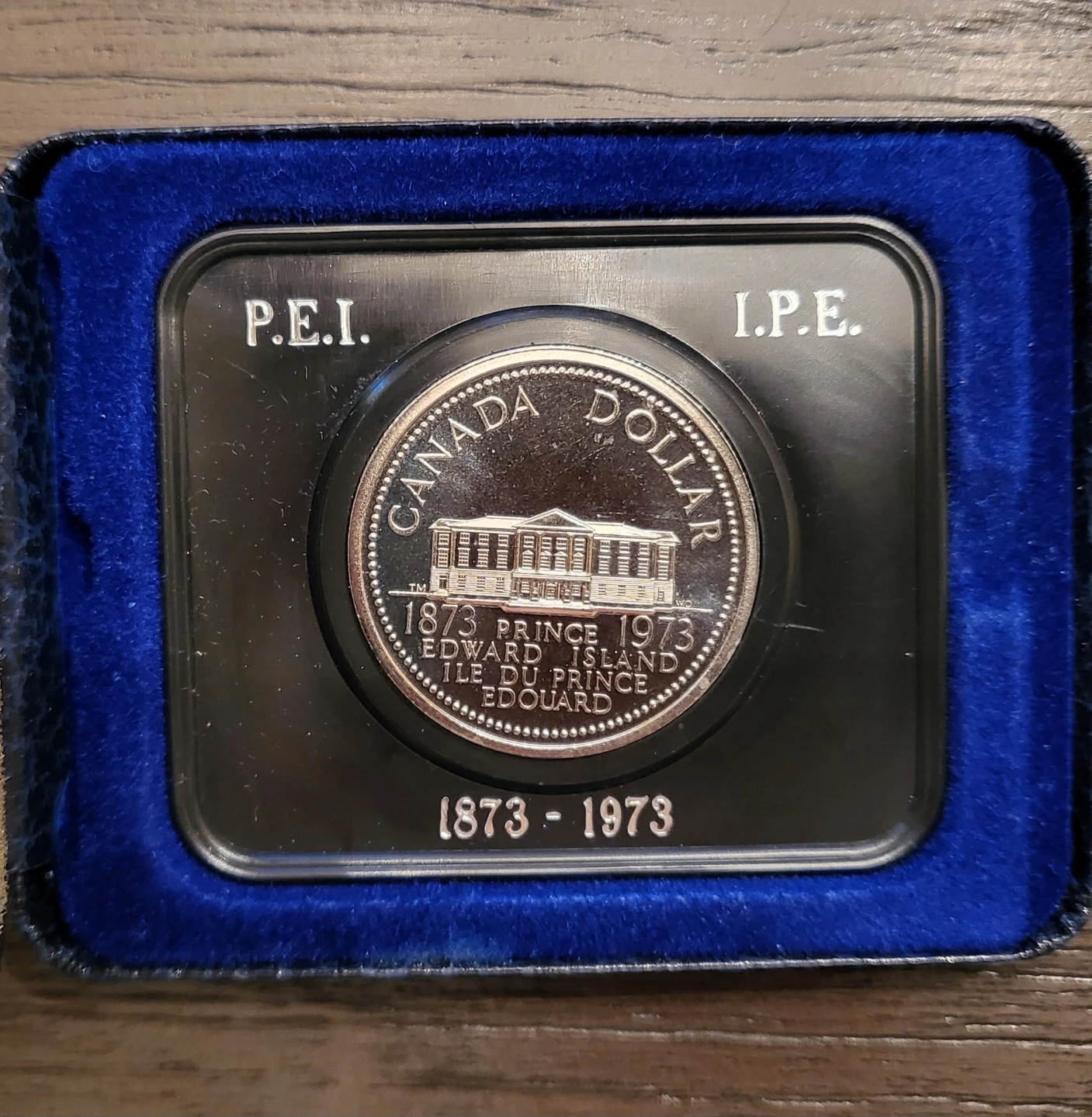 Here's a commemorative Canada Dollar coin celebrating Prince Edward Island from 1873-1973! Specifically PEI joining the Confederation. It comes in a blue clamshell case fully protected.