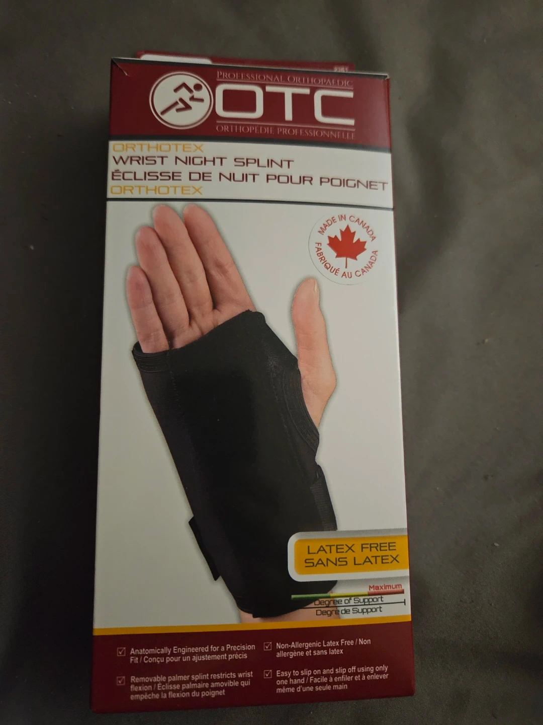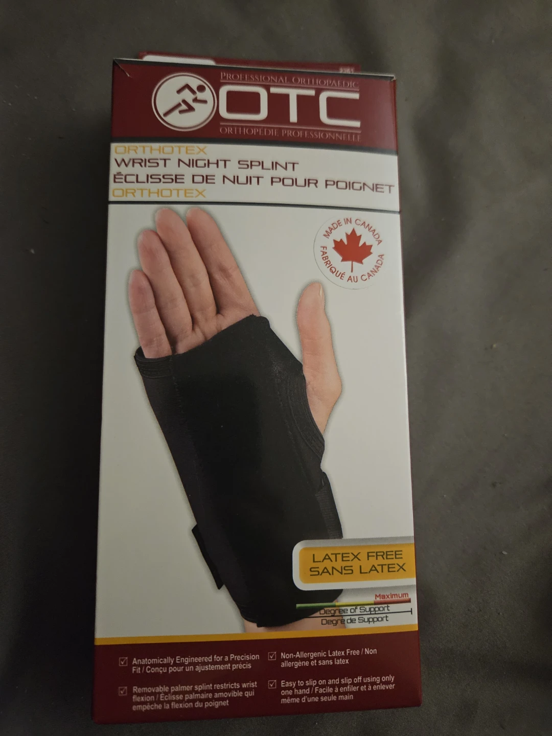 Selling an OTC Orthotex wrist night splint in size large. It's designed for the left hand and provides support while you sleep. Features include: