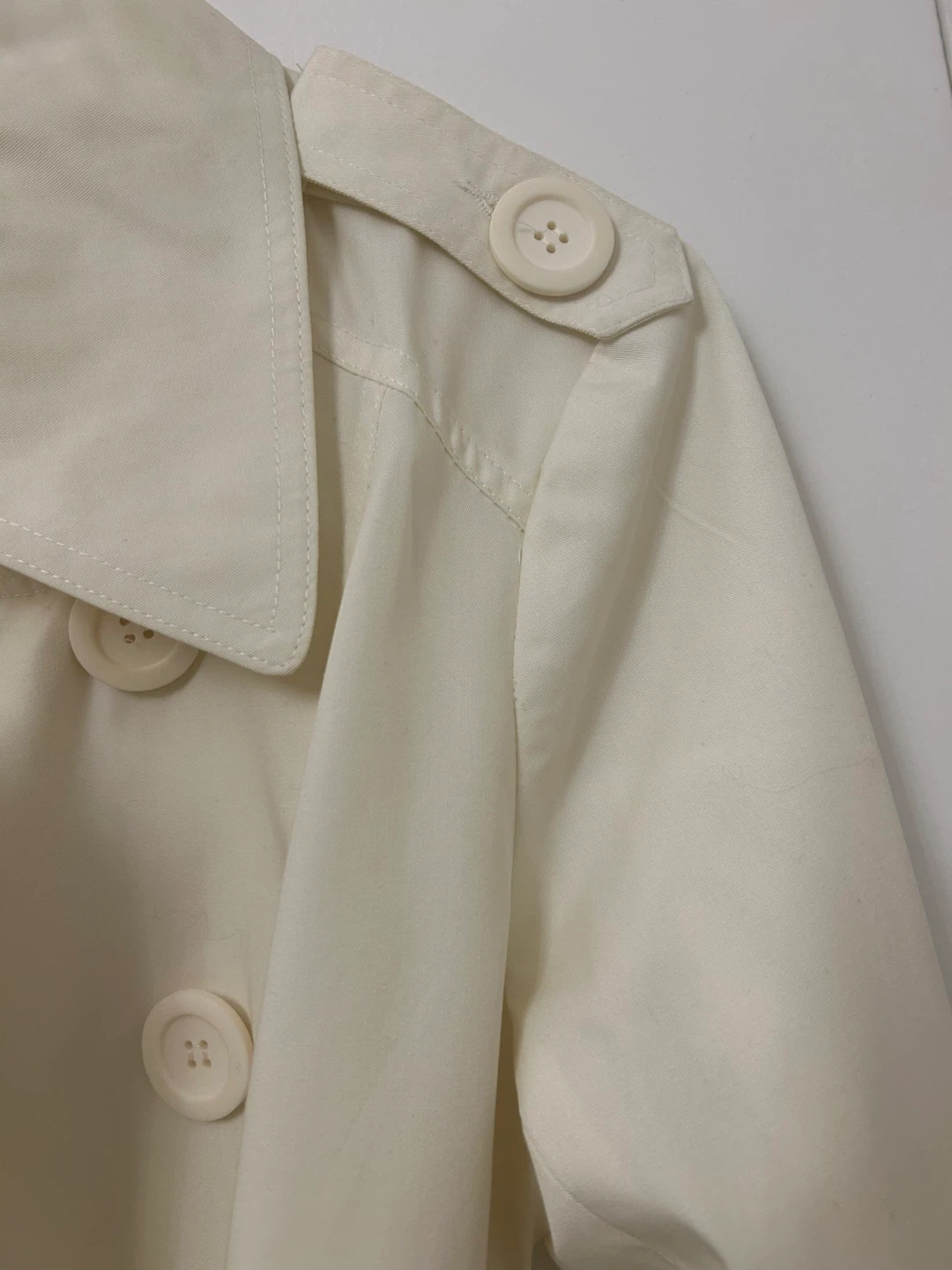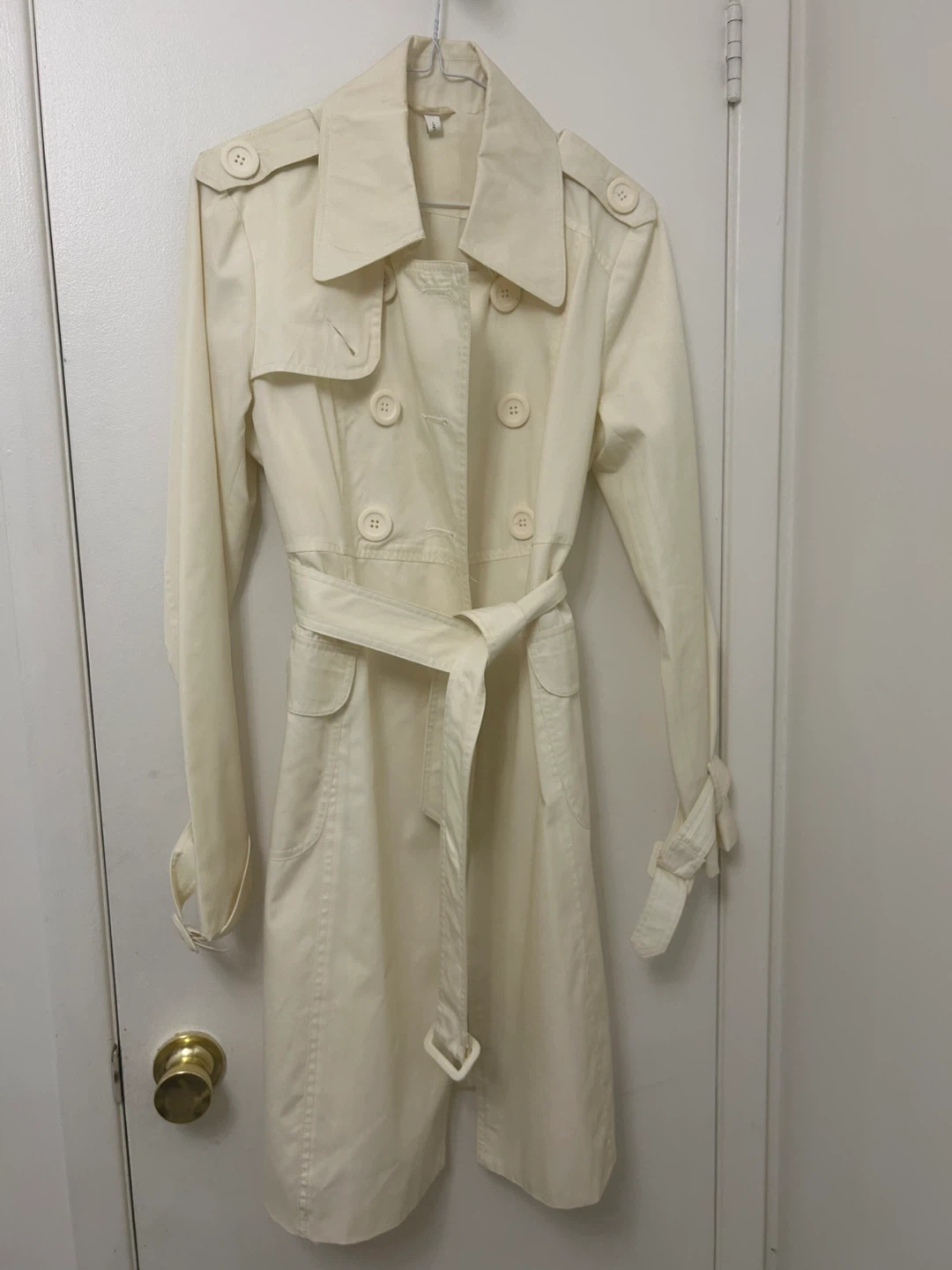 Selling a stylish off-white trench coat. It's in great condition and perfect for layering during the cooler months. The coat features a classic double-breasted design with a belt to cinch the waist. It has a timeless look that can be dressed up or down!