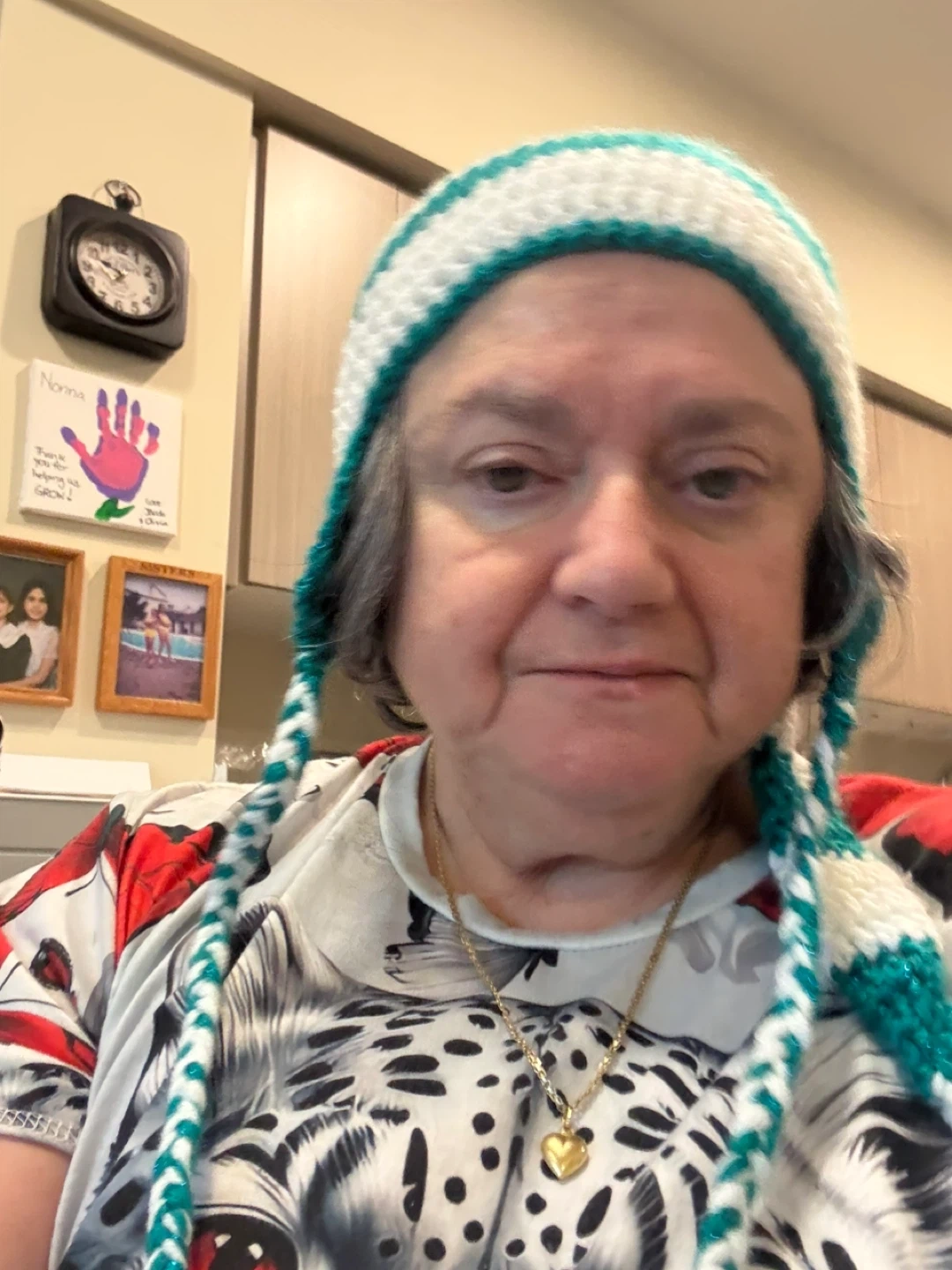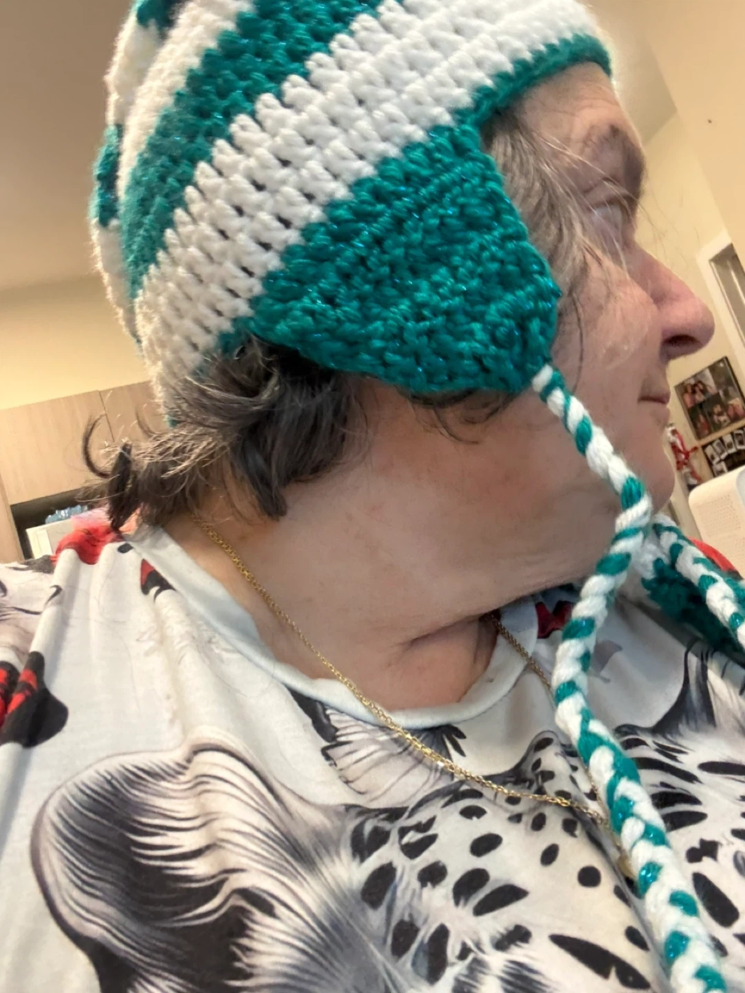 23Handmade green and white elf hat with ear flaps perfect for any Christmas celebration or just to wear during the month of December.