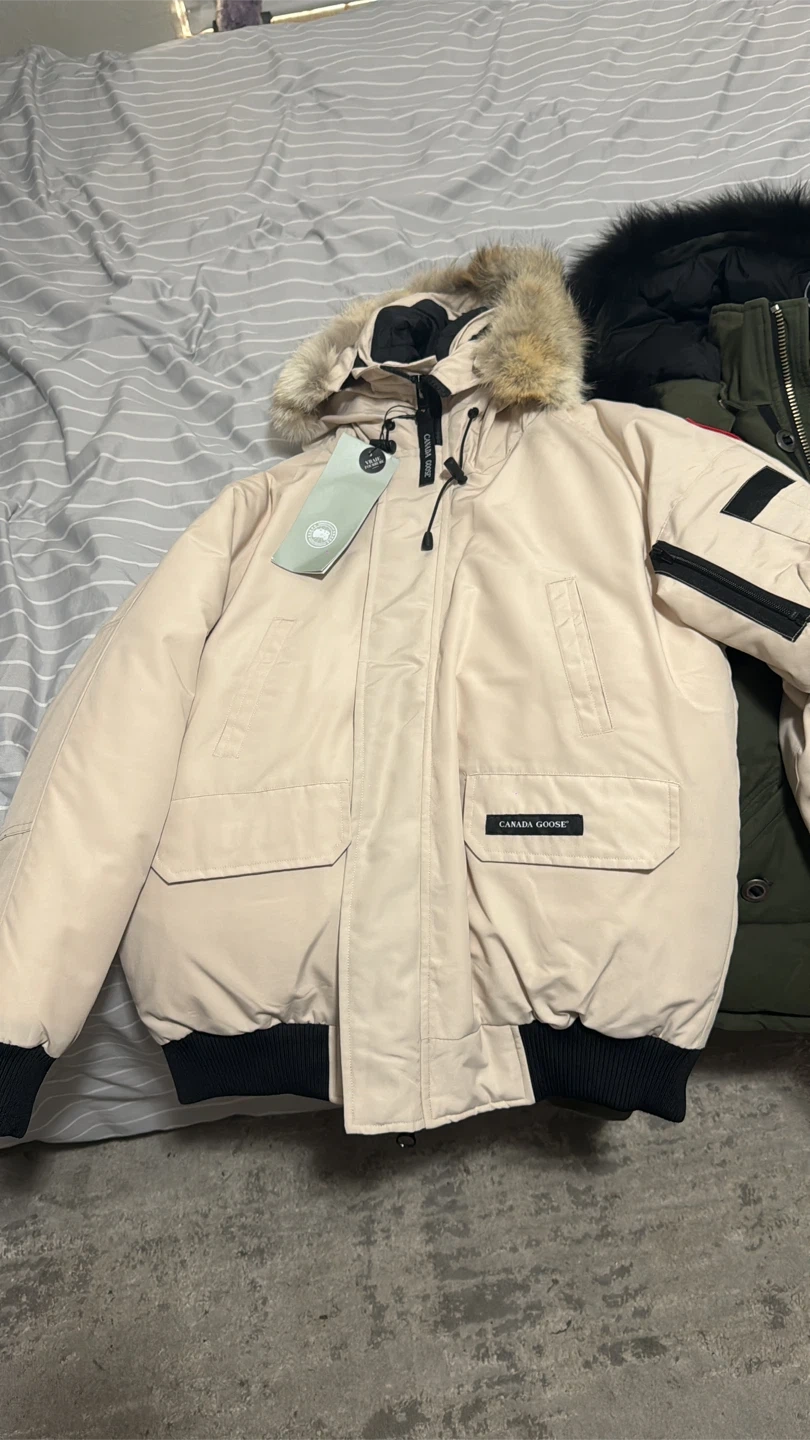 Selling a Canada Goose bomber jacket in beige. It's in great condition and perfect for the Canadian weather. The jacket features the iconic Canada Goose logo and a fur-trimmed hood to keep you warm and stylish!