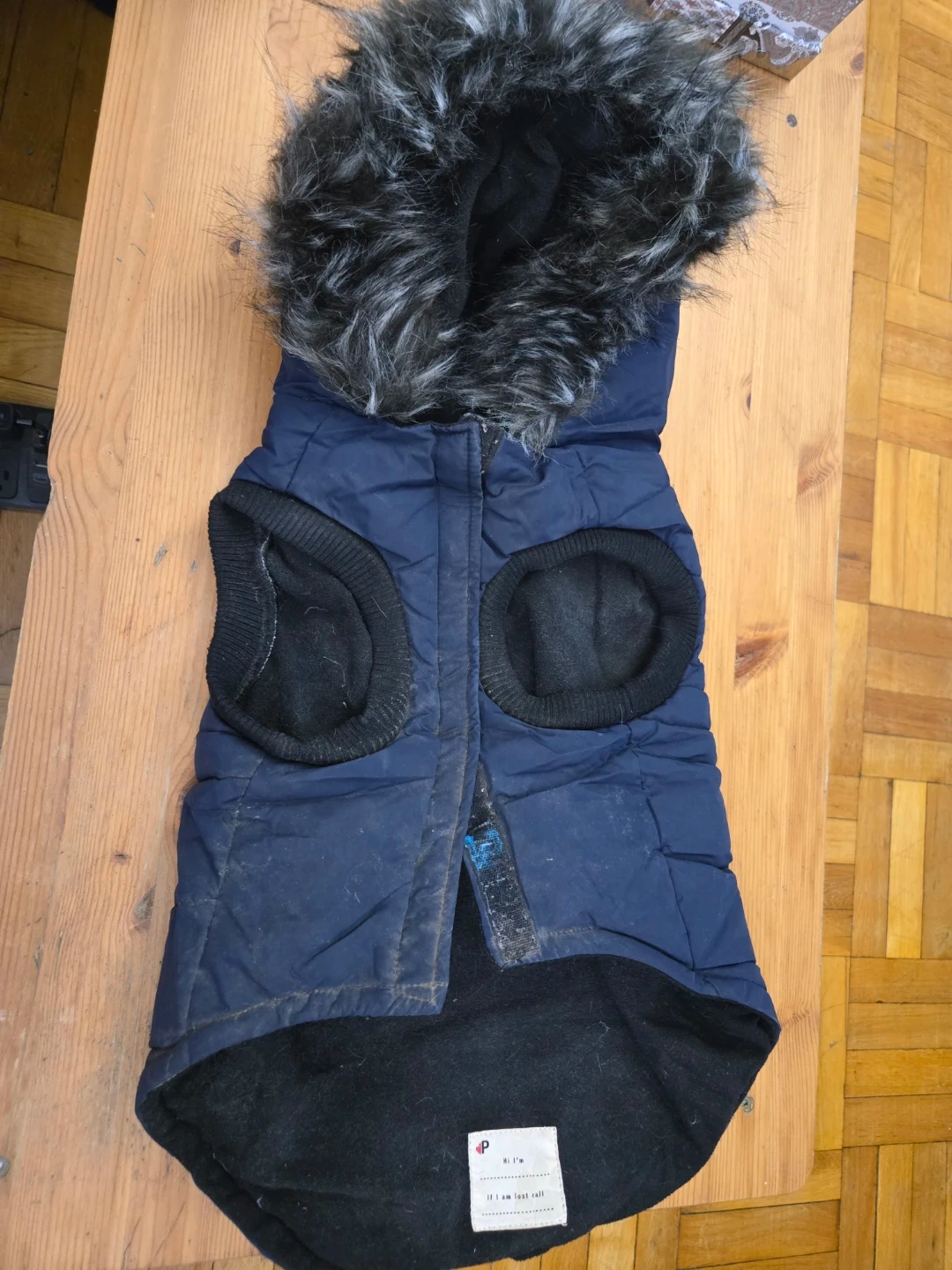 94Great condition warm, waterproof dog coat with fur trim hood and poo bag pocket Size large, fits a 25lb dog Needs a wash
