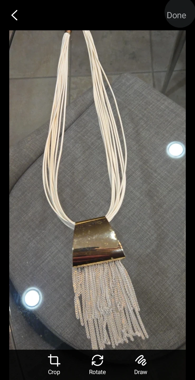 This is a beautiful statement necklace with white cords and a gold-tone accent piece with silver-tone fringe. It's in great condition and would add a unique touch to any outfit!
