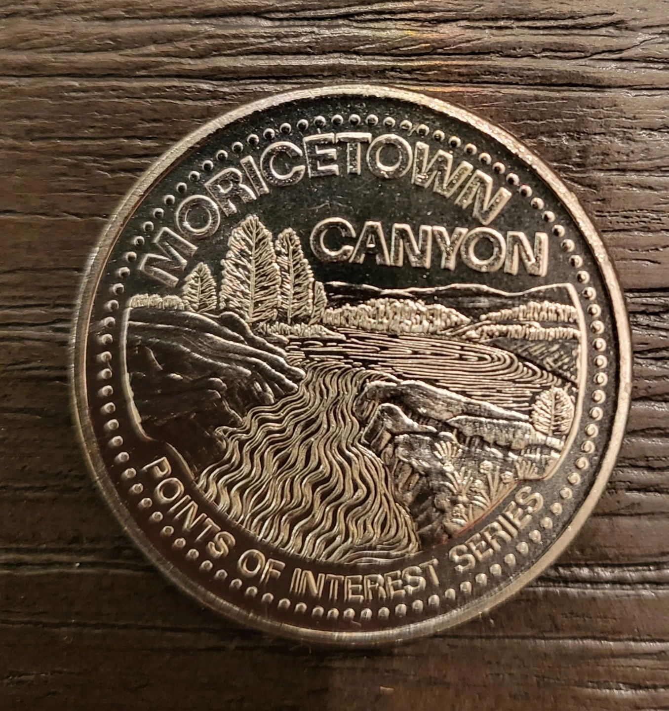 Moricetown Canyon British Columbia Commerative Token 1978 This token features a map of the region on one side and a landscape scene on the other.