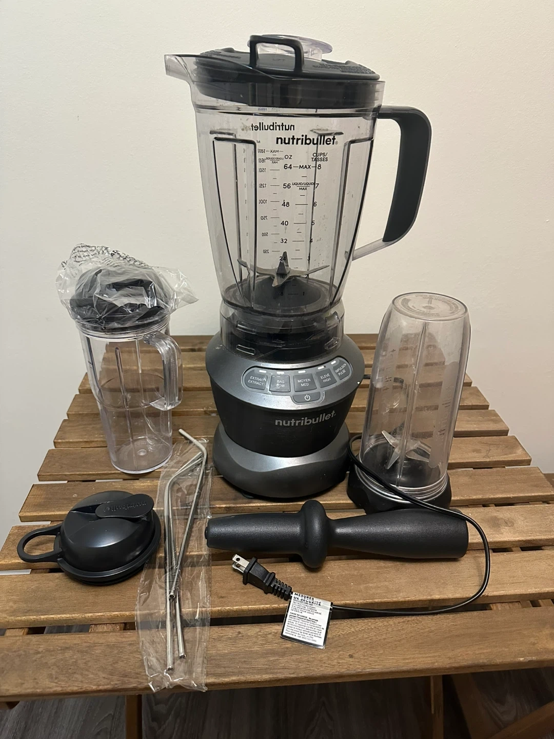 Selling a gently used NutriBullet Blender Combo! It comes with all the accessories you see in the photos, including the large pitcher, cups, lids, and blades. Also includes the recipe guide and user manual.