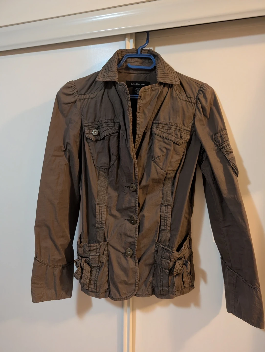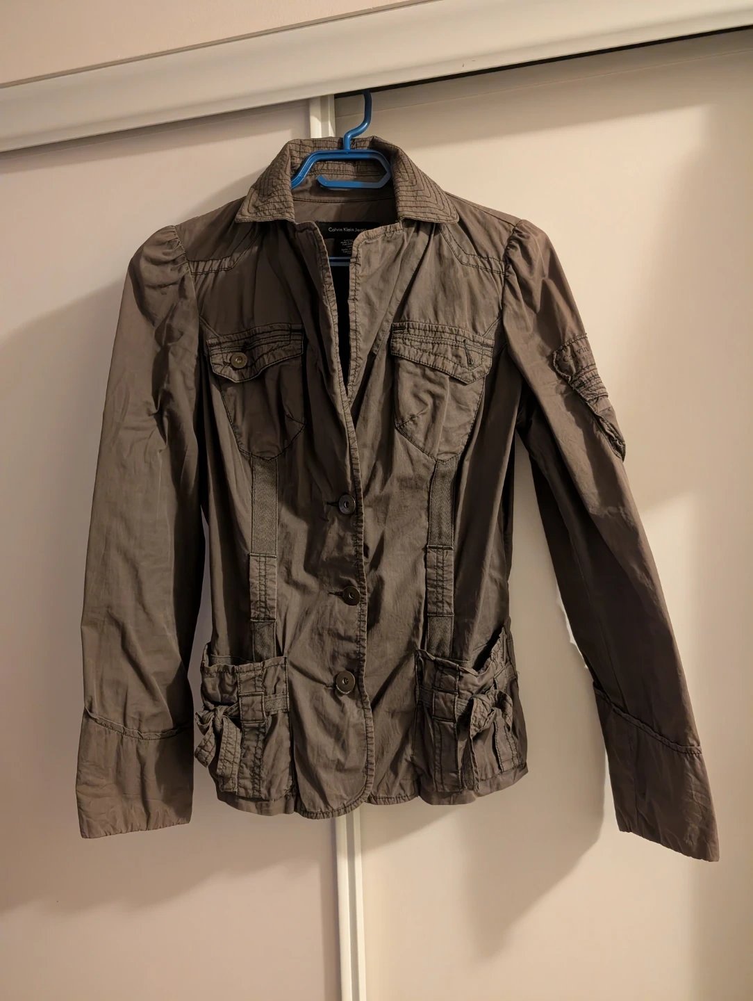101Selling a Calvin Klein Jeans jacket in size small. It's a stylish jacket with a unique design, perfect for adding a bit of flair to your wardrobe! It has a few pockets and a button-up closure.