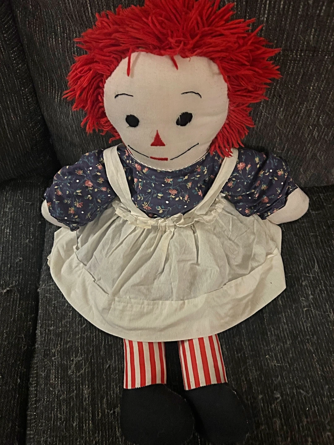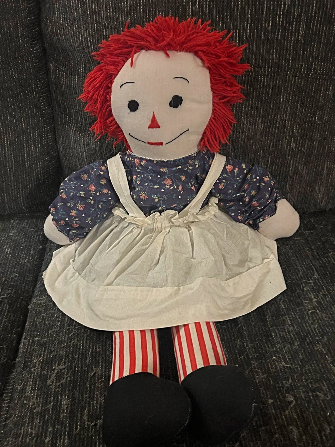Selling a Raggedy Ann doll! She's in great shape and ready for a new home. She has the classic red yarn hair, button eyes, and a sweet embroidered smile. Her outfit includes a floral print dress with a white apron and striped leggings. A lovely vintage doll for collectors or a child who loves classic toys