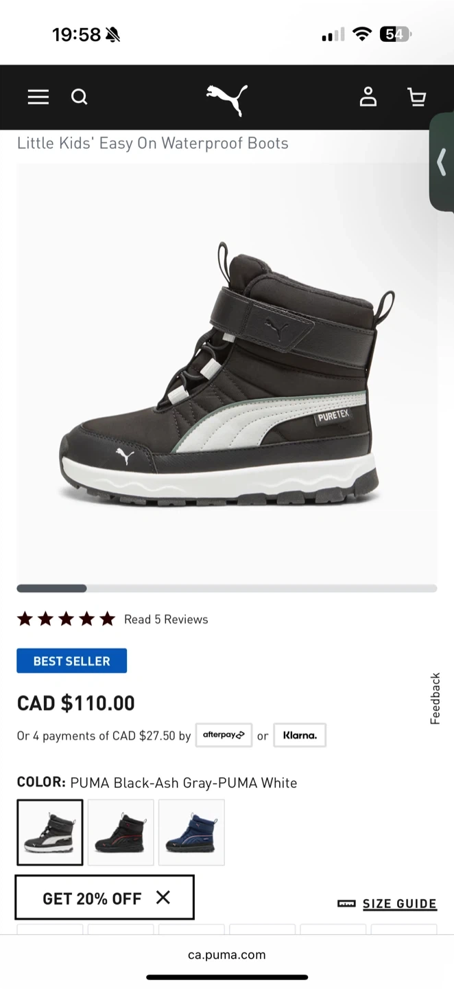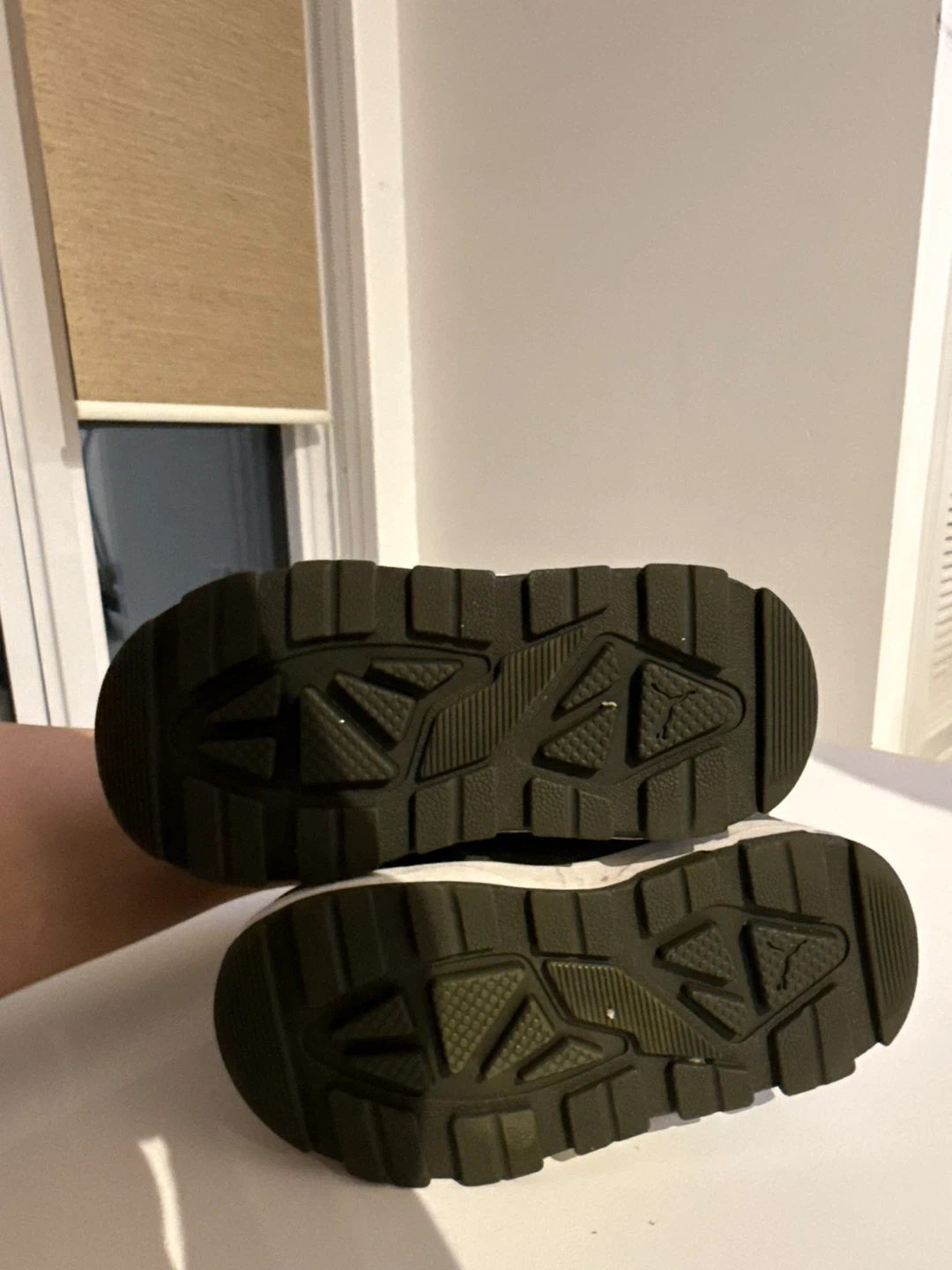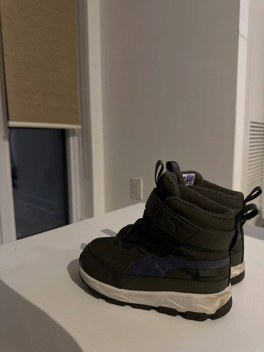 These are PUMA Little Kids' Easy On Waterproof Boots in an olive green color! They are in good condition and ready for some fun in the snow or rain. These boots are designed to be easy for little ones to put on themselves, making them perfect for independent kids. They retail for $110 CAD.