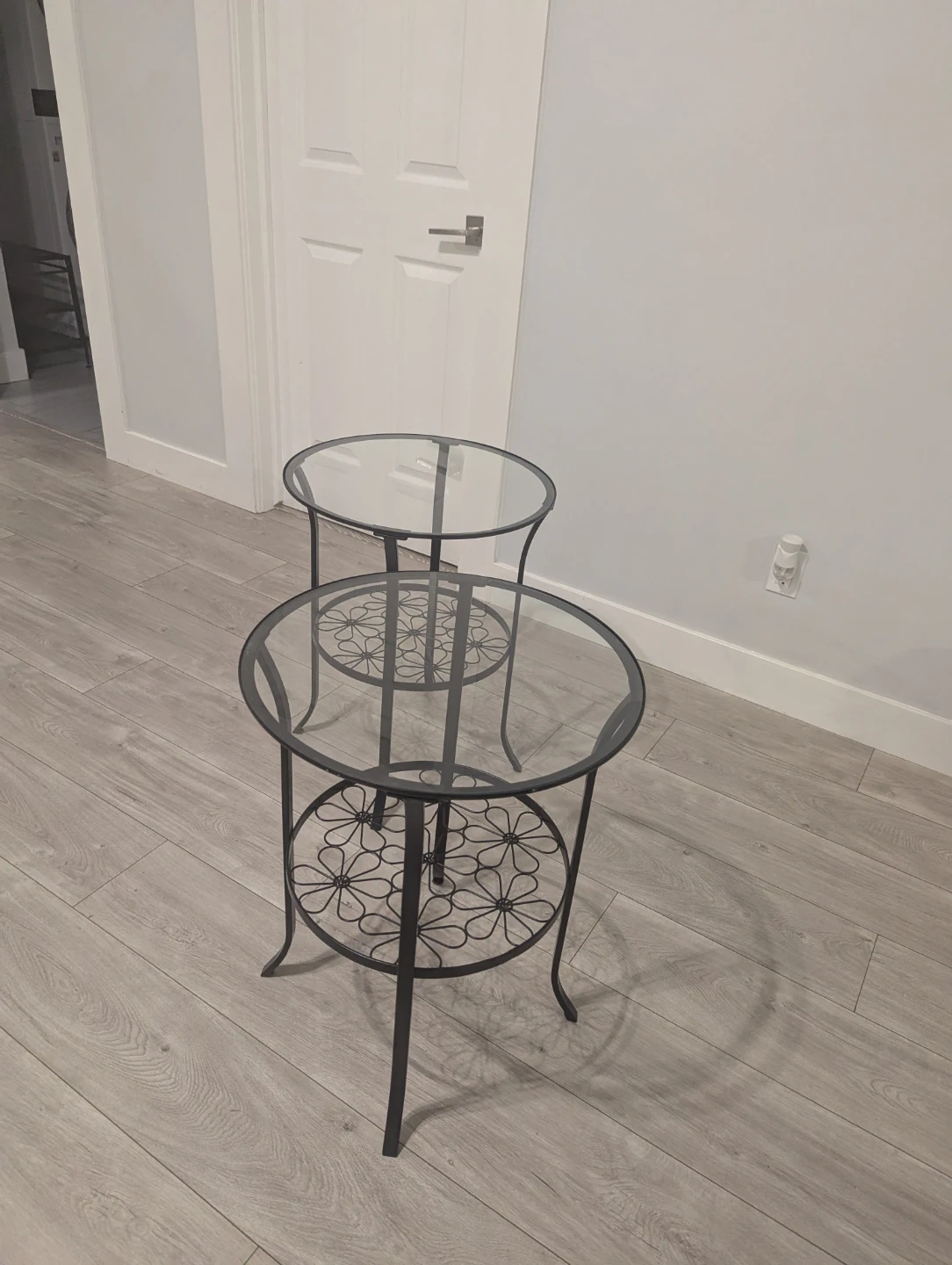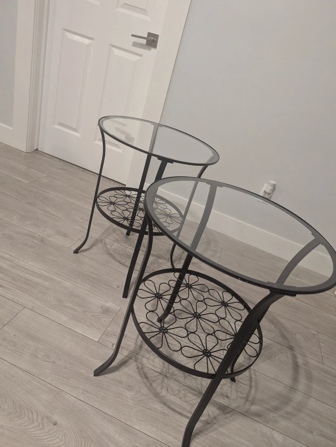 Selling a set of Ikea Klingsbo two side tables with glass tops and decorative metal bases.