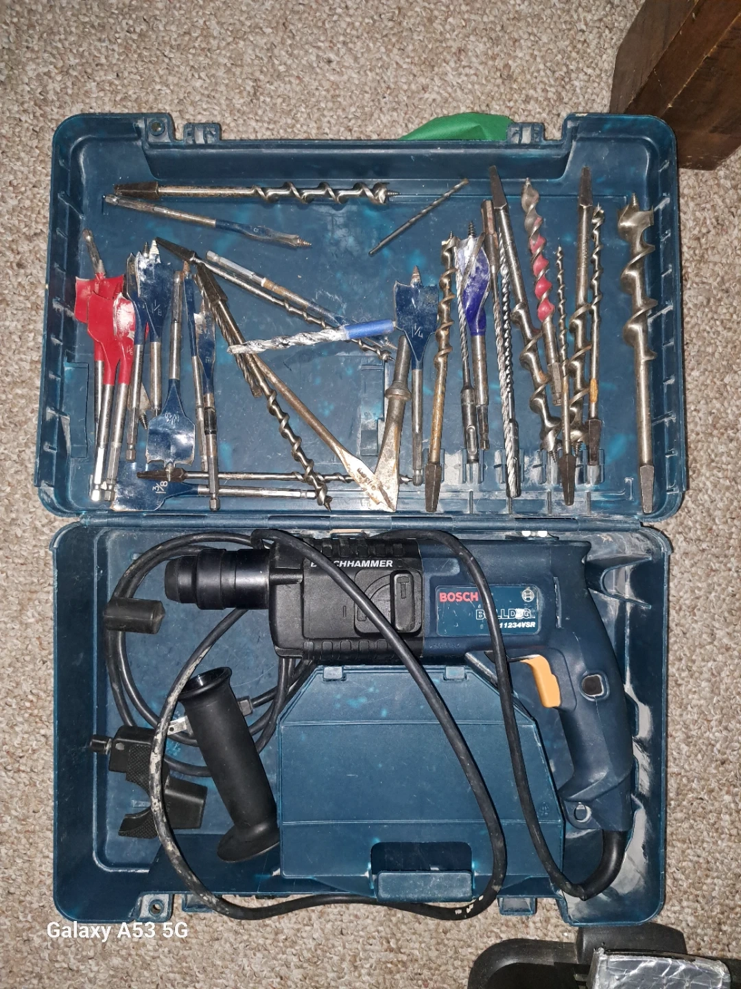 Selling a Bosch Bulldog 11234VSR rotary hammer drill. It comes with a variety of drill bits and the original carrying case. Great for any handyman or construction worker! Used twice