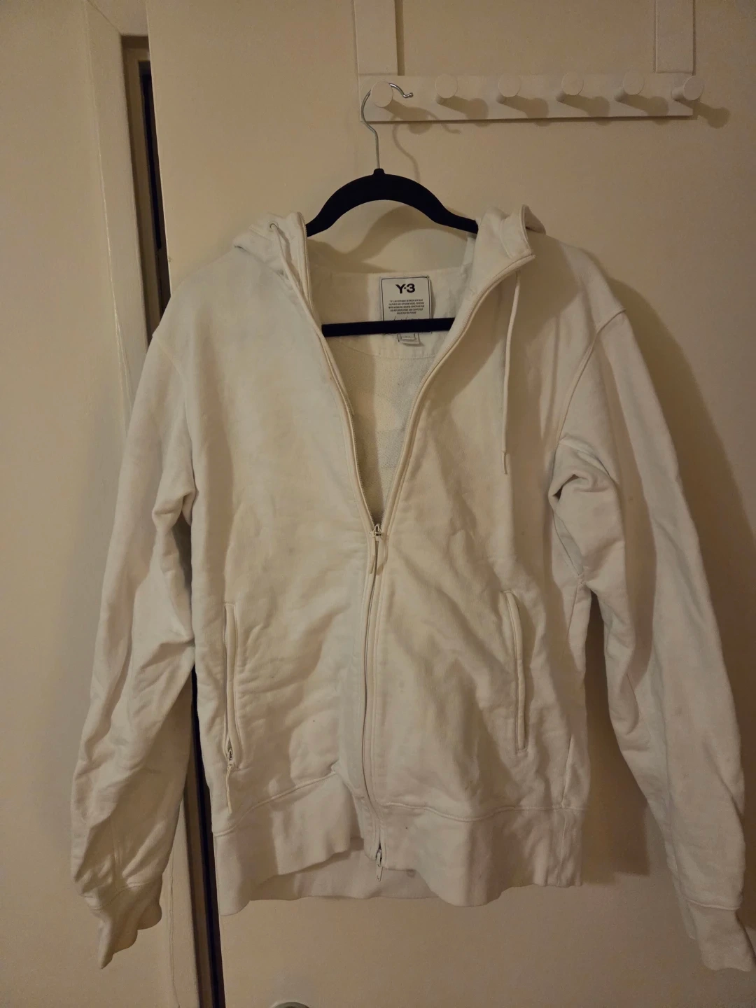 Selling a white Y-3 hoodie. The size is M/M. It's in great condition and ready for a new home!