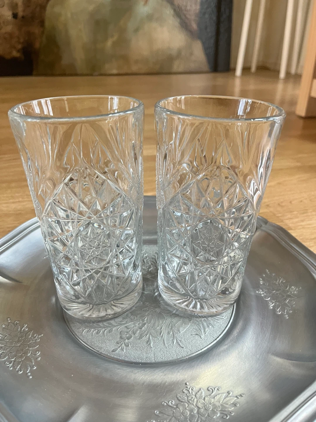 Selling a set of 2 Libbey Hobstar highball or cooler glasses. This style features a classic design with a signature hob and star pattern that gives a vintage, cut-crystal appearance.