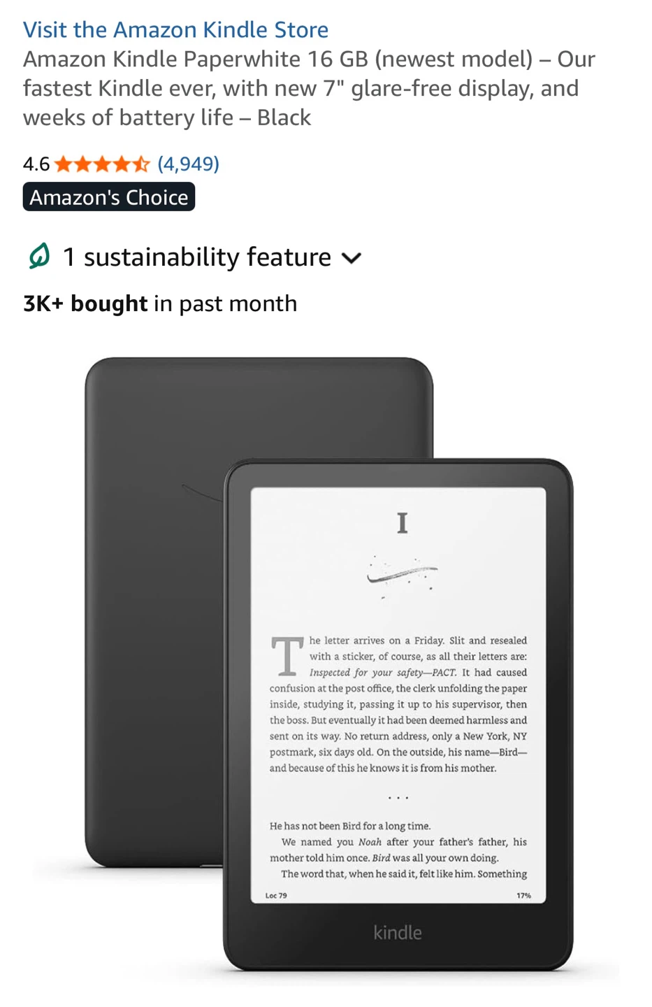 Selling a brand new, still-in-box Kindle Paperwhite (12th generation). It comes with 16GB of storage. This latest model has a 7" glare-free display, perfect for reading anywhere. Also included is a USB-C cable for charging. Enjoy weeks of battery life!