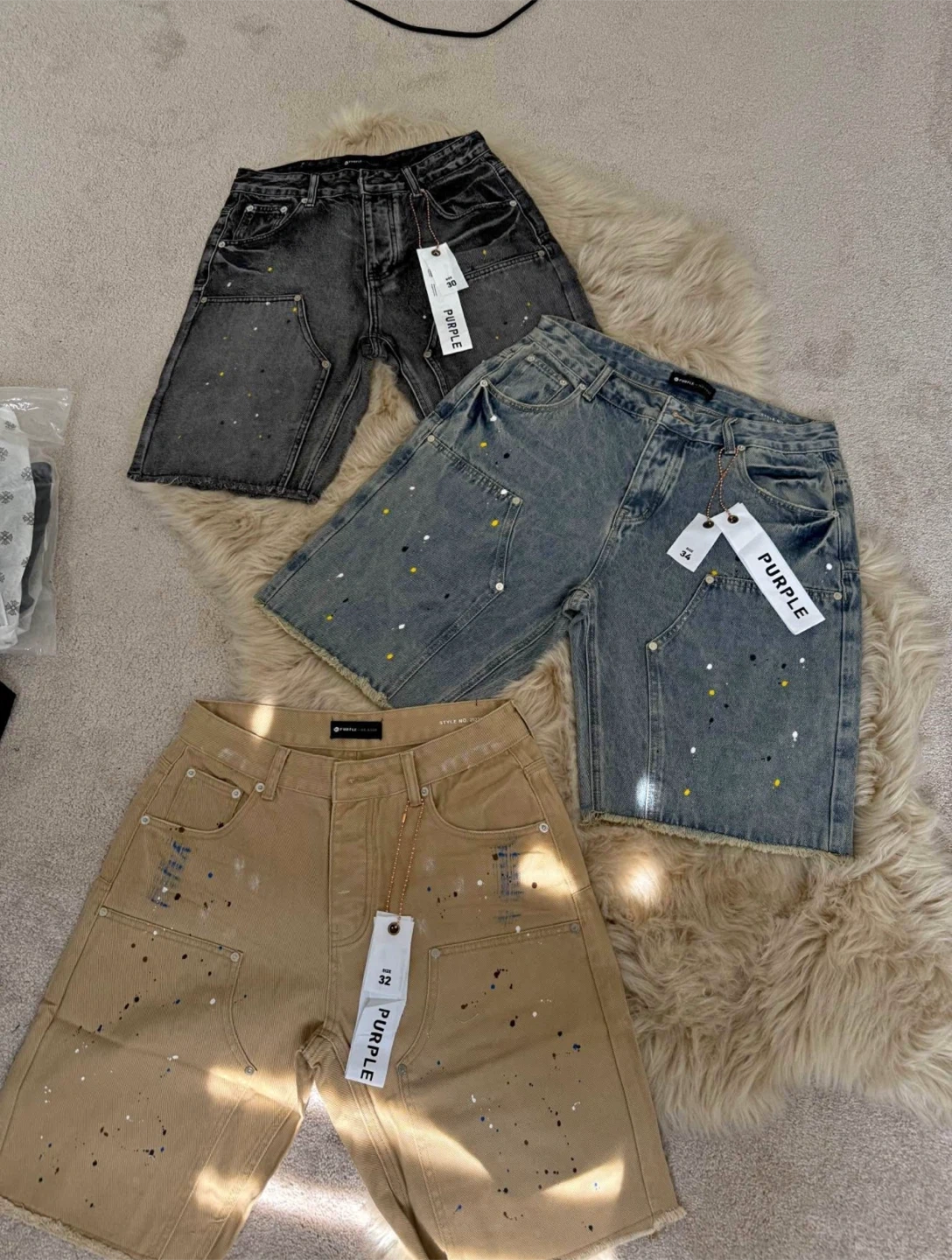 Selling a pair of Purple Brand carpenter shorts. They come in a size 32 and have a cool, unique design with paint splatters. Great for a casual, stylish look!