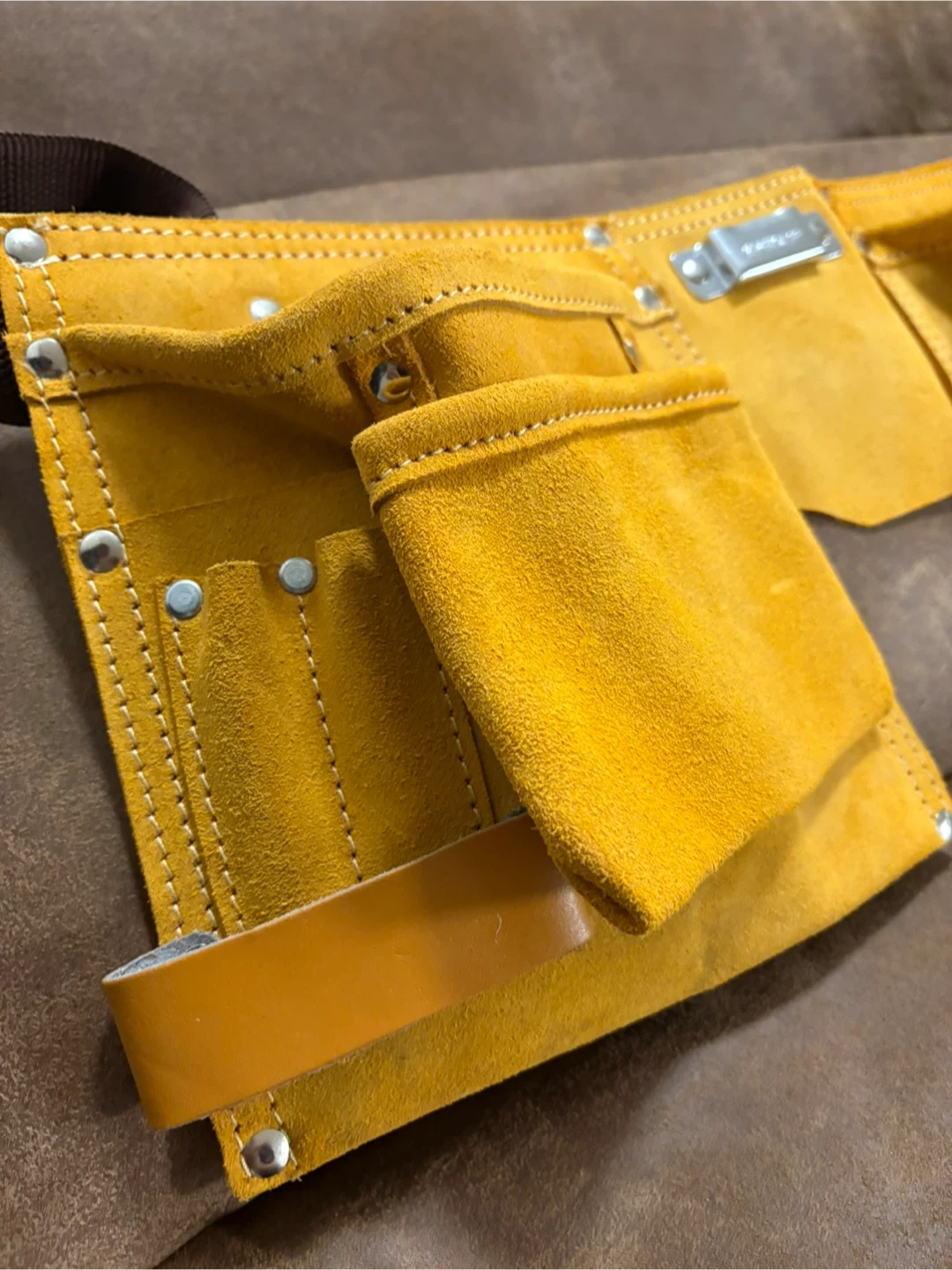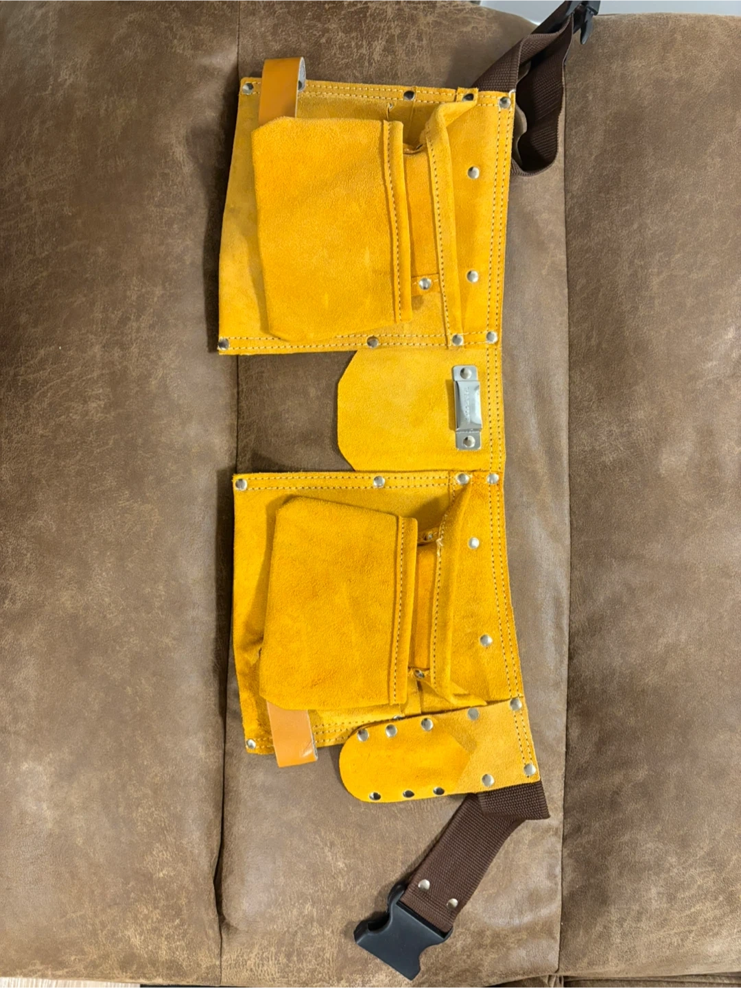 Here's a sturdy yellow leather tool belt, perfect for any job! It features multiple pockets and a tape holder for convenience. The belt is in great shape and ready for its next project