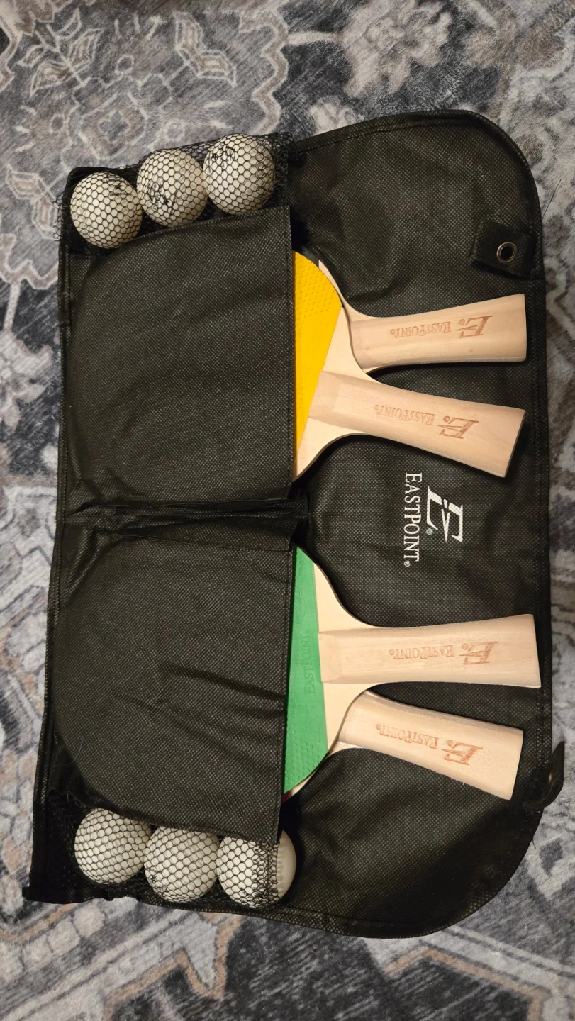 222EastPoint table tennis set includes four paddles with yellow and green rubber, and several balls, all in a convenient carrying case