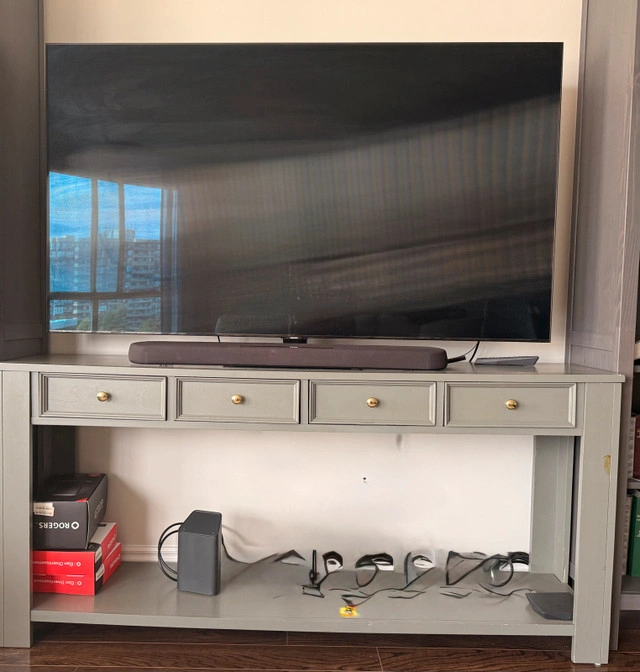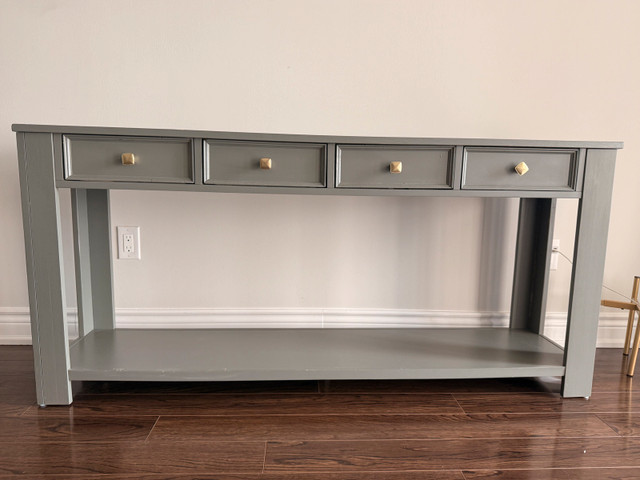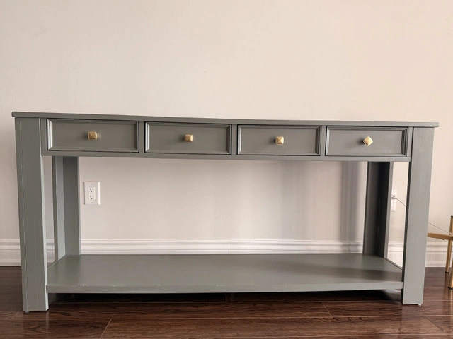 This grey console table is a stylish and functional addition to any home, featuring a sleek design with four drawers and a lower shelf, perfect for entryways or living rooms. This unit has been previously owned, and is in good condition. (2 consoles available)