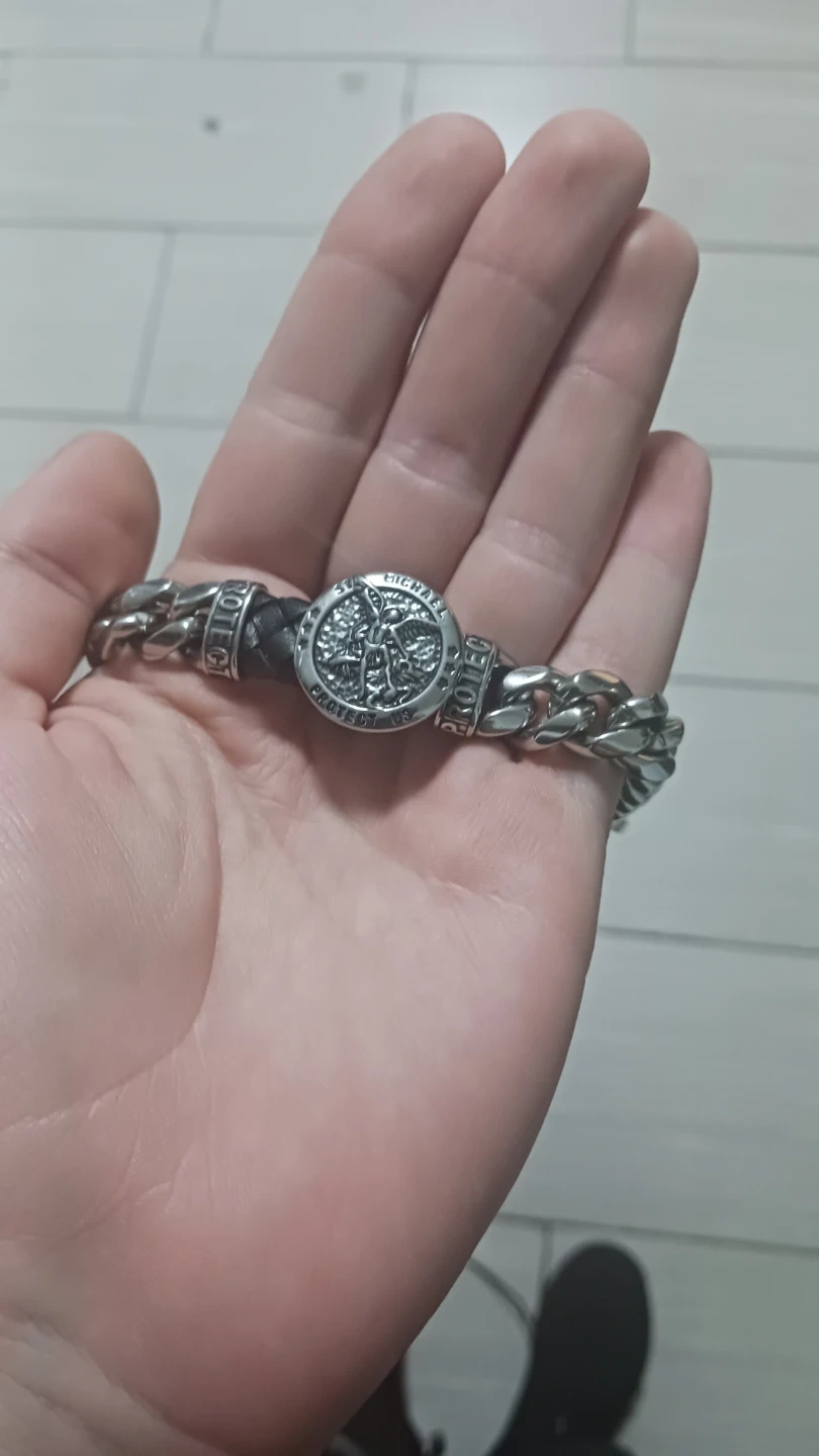 Selling a bracelet with a St. Michael medallion. The bracelet features a chunky chain design with a braided leather accent. It's in great condition and ready for a new home!