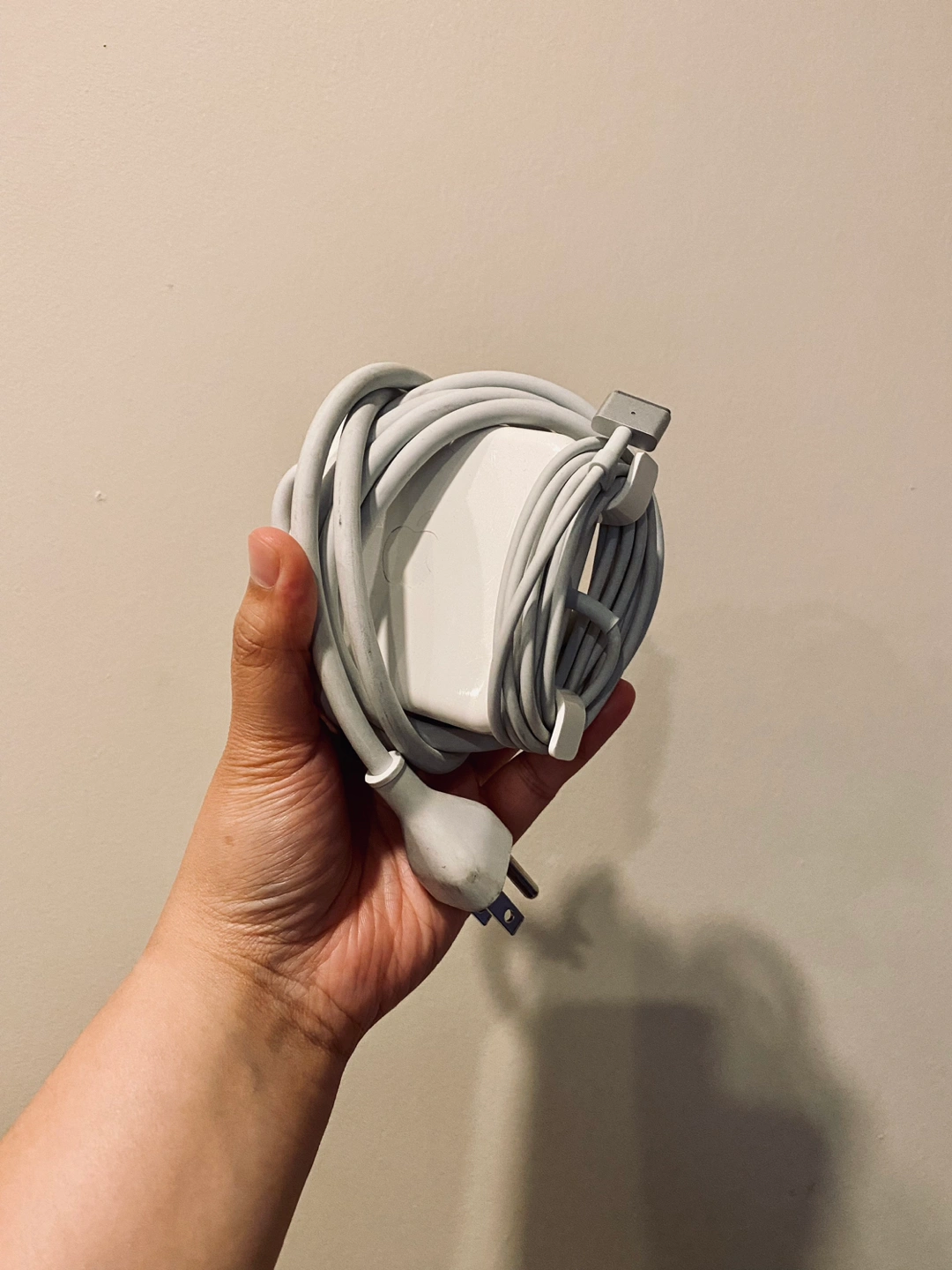 A used Apple power adapter for 15- and 17-inch Macbook Pro models introduced in 2006 through 2009.