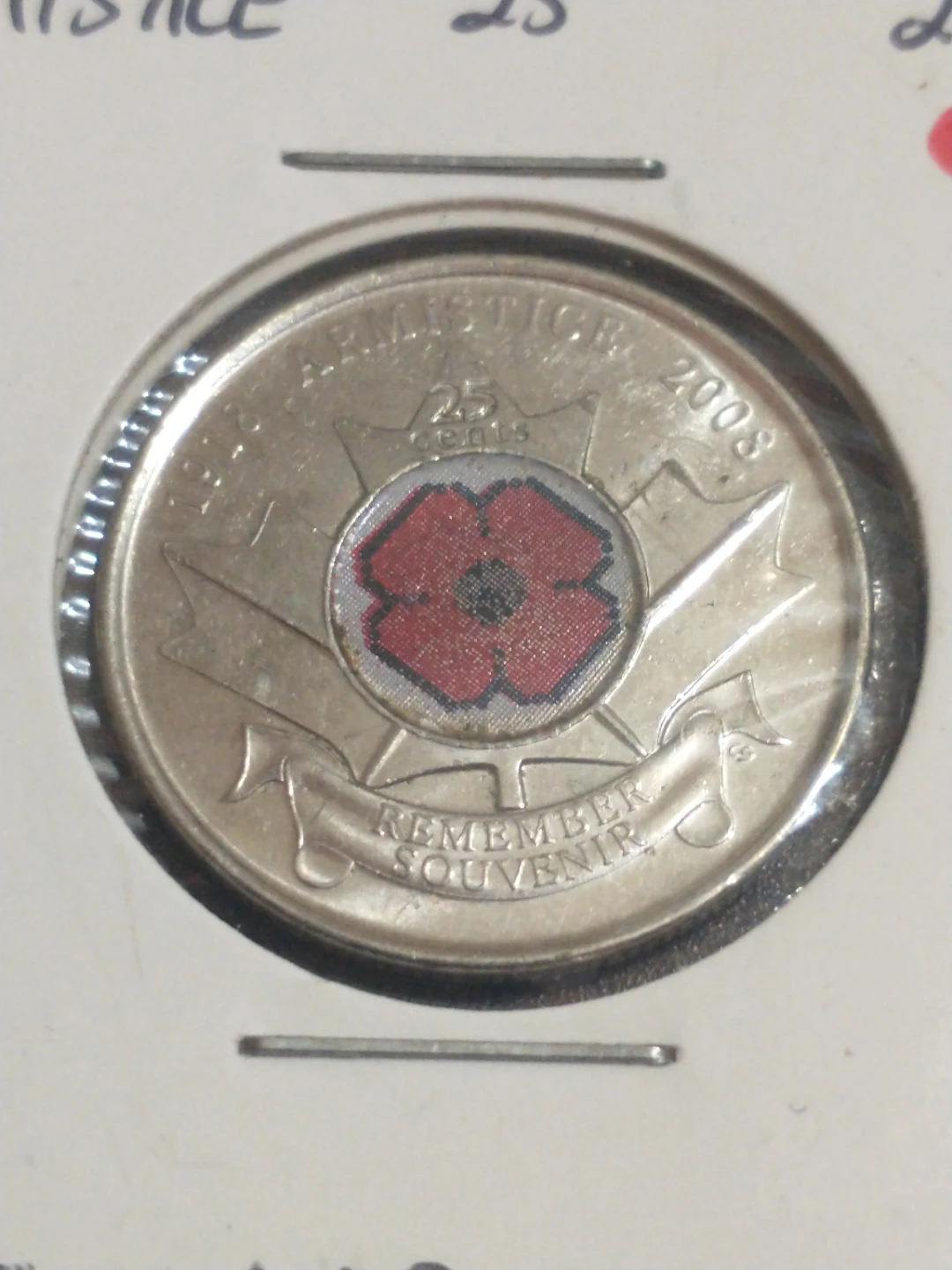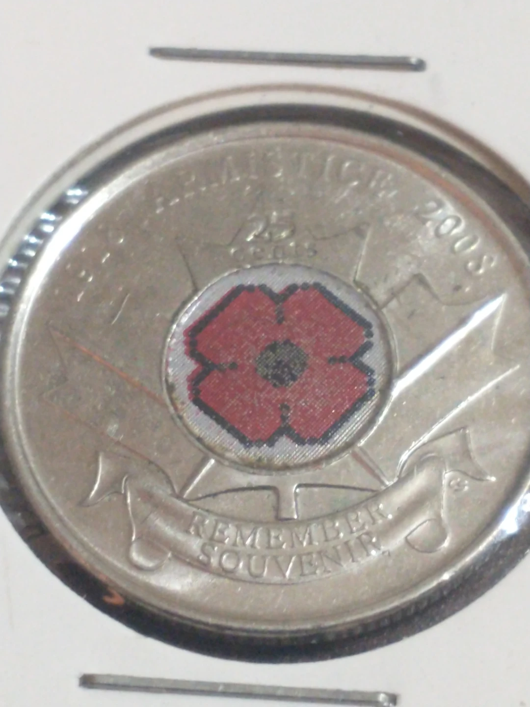 #2015-1442 in CB2. Selling a 2008 Canadian 25 cent coin commemorating Armistice. It features a poppy design and the words 'Remember Souvenir'. A nice addition to any coin collection!