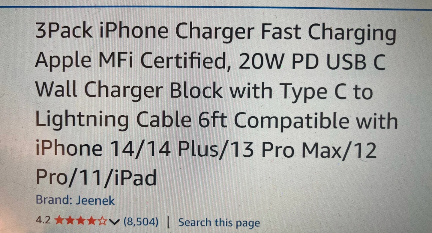 Selling a Jeenek 2-pack of iPhone chargers. It is brand new, and still in the original box. These are fast charging and Apple MFi certified. Each charger is 20W PD USB-C wall charger block with a Type-C to Lightning cable (6ft). Compatible with iPhone 14/14 Plus/13 Pro Max/12 Pro/11/iPad. $11.50 for ONE. Smoke & pet free house.