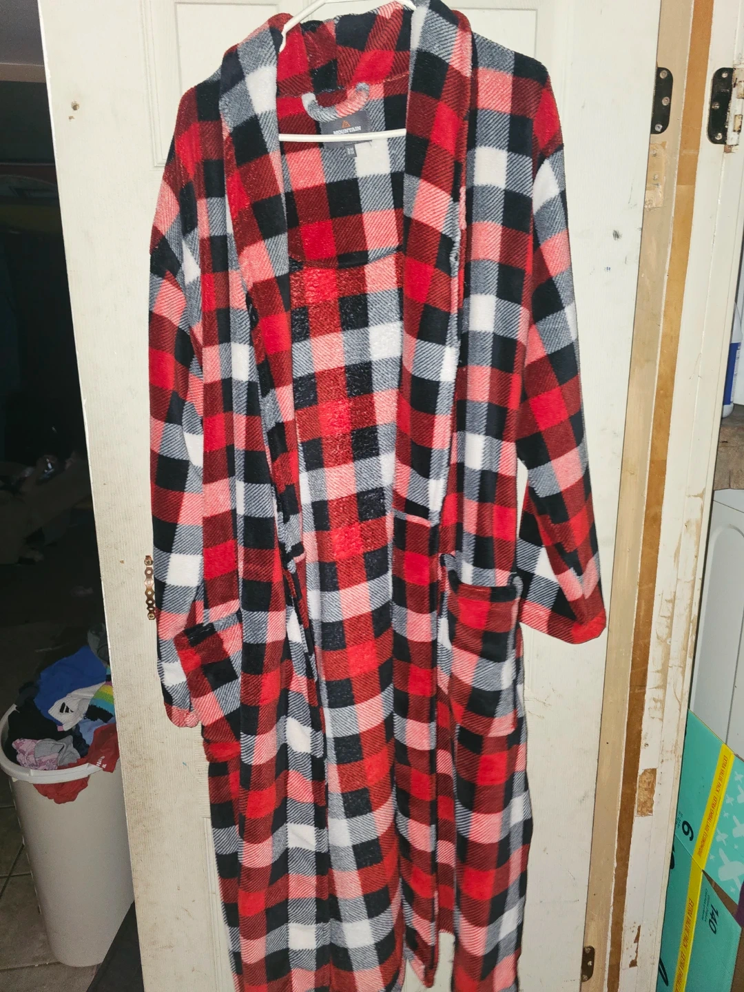 90Cozy up with this Mountain Ridge robe! It features a classic red, black, and white plaid pattern. Perfect for lounging around the house on chilly days