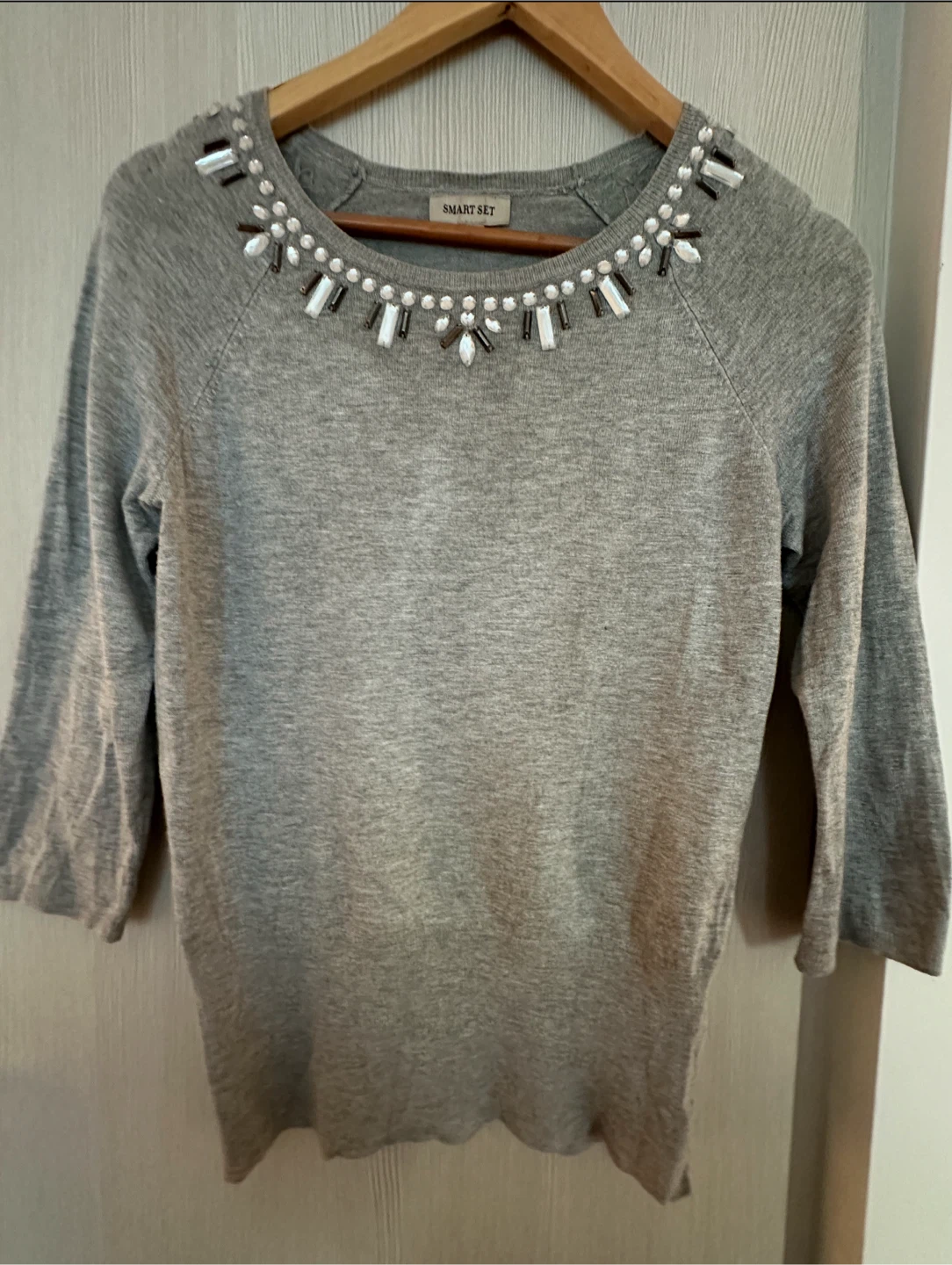 Do you remember the brand Smart Set? I am selling a Smart Set grey sweater. It's a size P/S and features decorative embellishments around the neckline. Great for adding a touch of sparkle to your outfit in this fall / winter season!