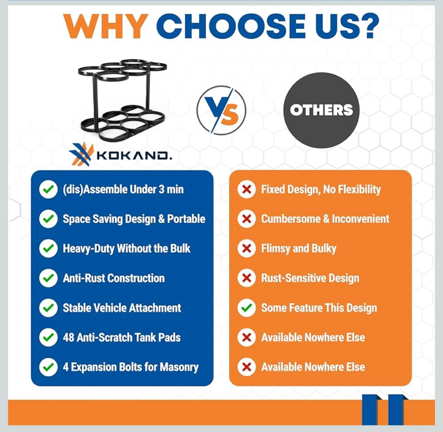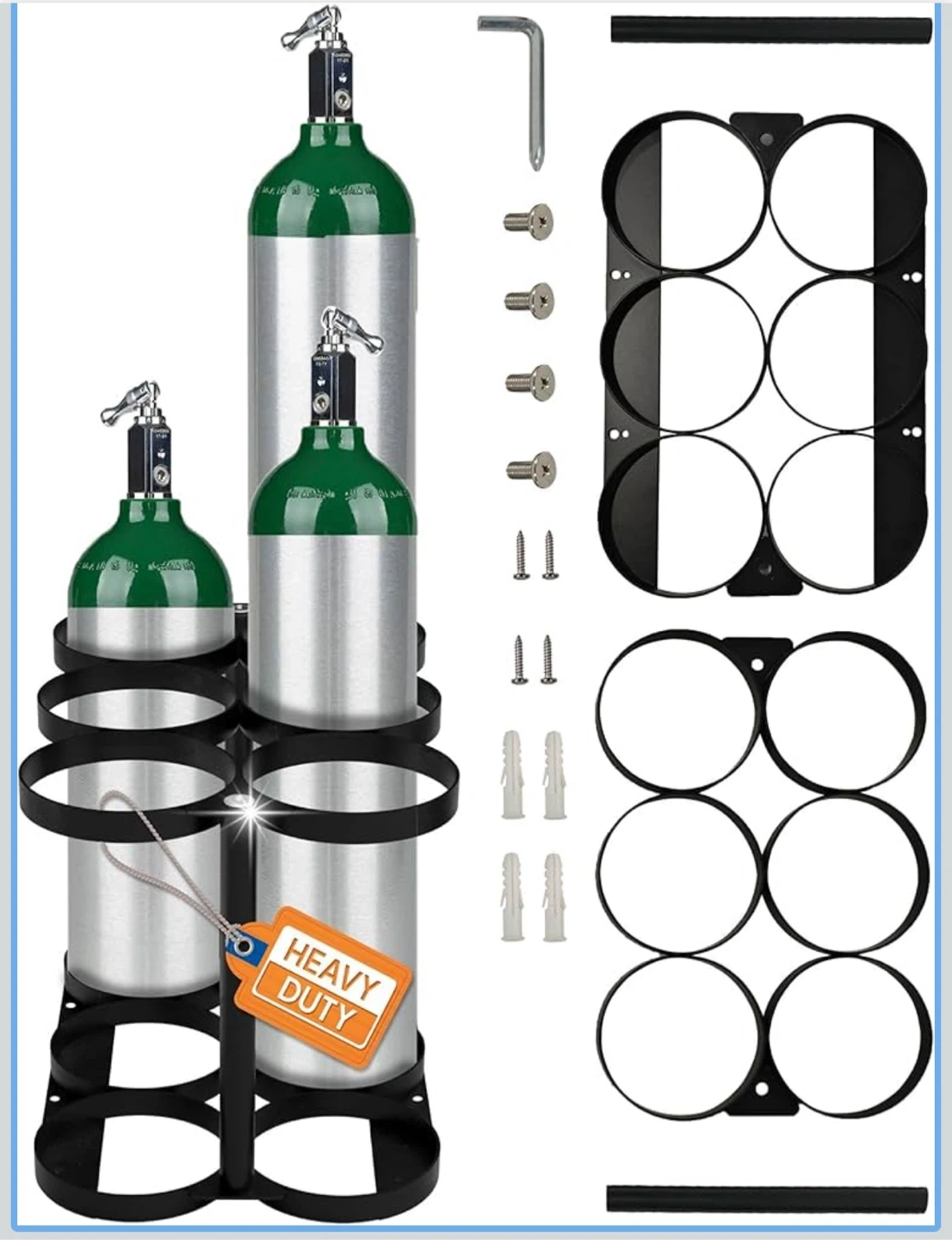 This Kokand Oxygen Cylinder Tank Holder is designed for E, D, and M9/C size oxygen cylinders/tanks. It features a compact yet spacious design. It can be assembled in under 3 minutes and tools are included for your convenience! It's heavy-duty without the bulk and has anti-rust construction.