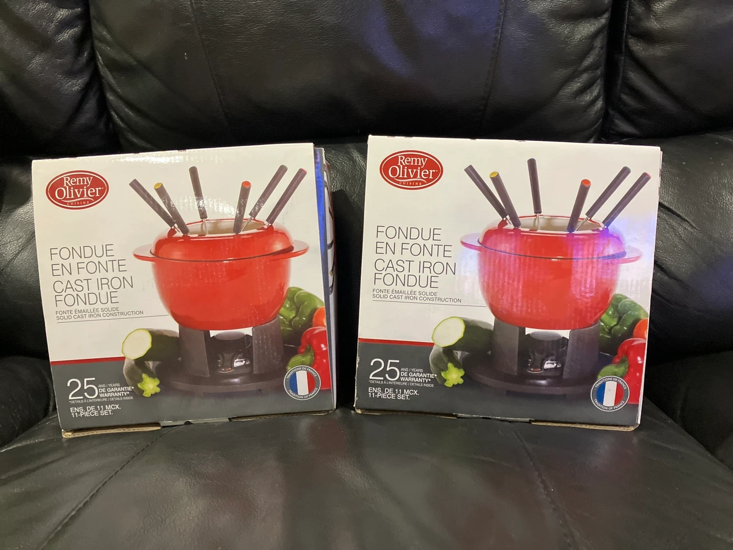 60Selling 2 brand new Remy Olivier cast iron fondue set! It's an 11-piece set, perfect for a cozy night in. The fondue pot is made of solid cast iron construction. Price includes both sets.