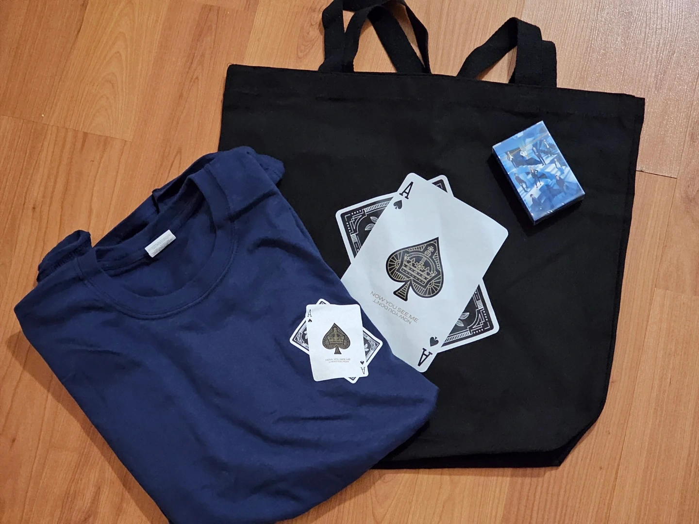 Selling a Now You See Me Now You Don't Official Merchandise Tote Bag, Playing Cards & T-Shirt set! All items feature the movie title design. The tote bag is black, the t-shirt is navy blue, the playing cards are sealed deck with plastic. Great for any fan of the movie!