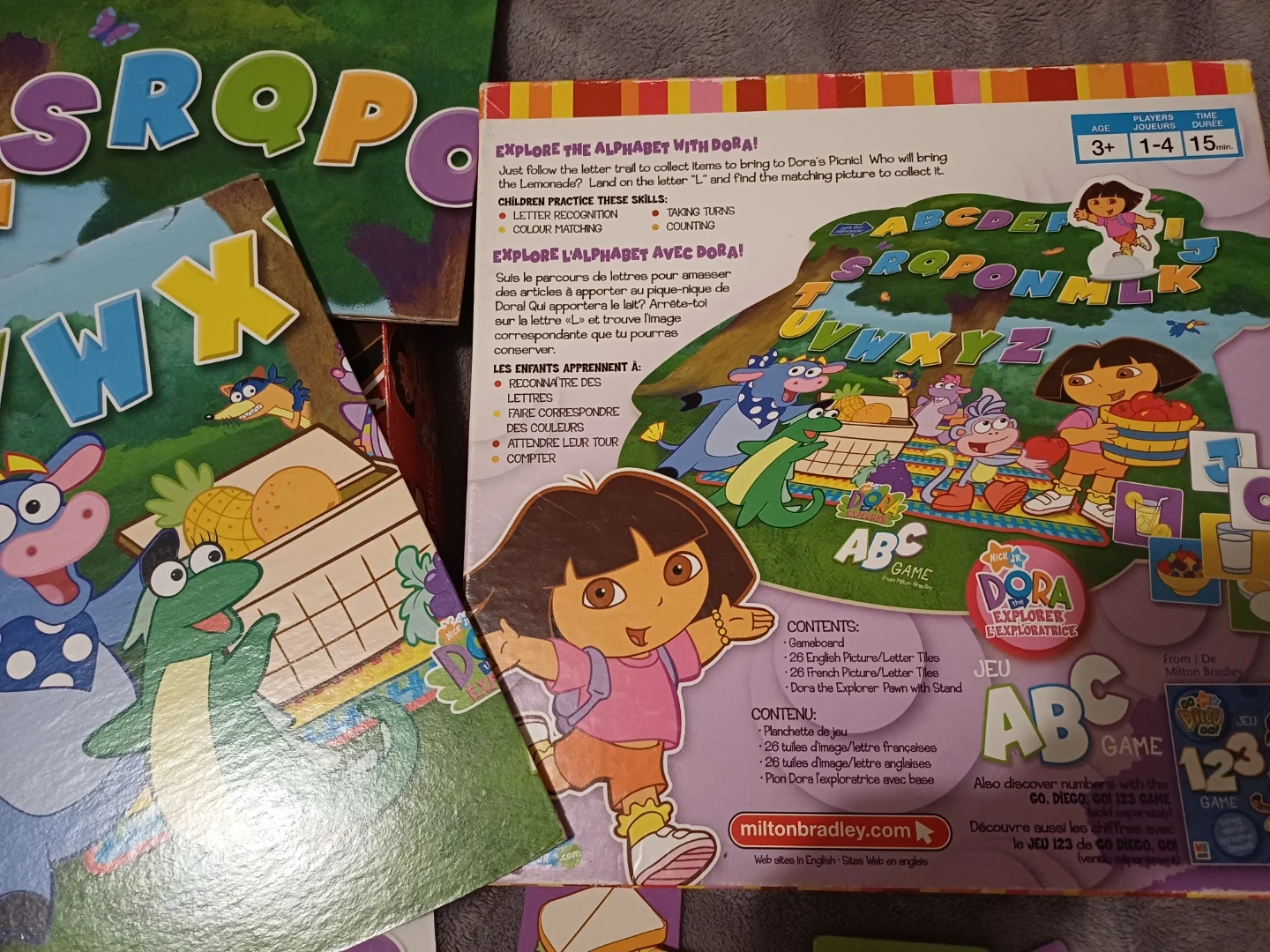 1000+An incomplete 'Dora the Explorer ABC Game' from Nick Jr. with Letter Pieces that have a picture that is a French word. My 2 year old grandchild enjoyed saying the LETTER and placing it on top of the correct Letter Spot on gameboard path. IT IS MISSING 2 LETTER PIECES (has 24 instead of 26). *I planned to make 2 pieces from cardboard but have not done that yet. *I planned to glue pictures ON TOP of the French picture shown for 11 Letter Pieces that did not match up for English. Example: Picture of APPLE is on the P.... for "Pomme".