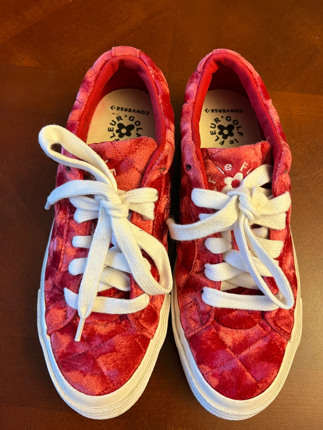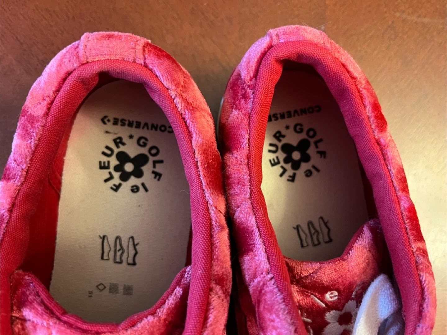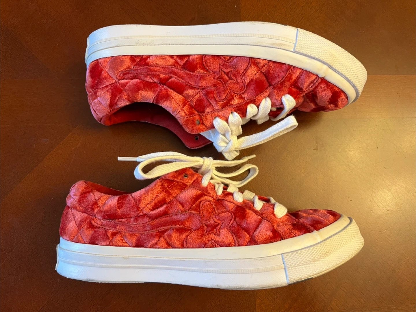 Converse Golf Le Fleur x One Star sneakers in the ‘Quilted Velvet Cherry’ colourway: a 2019 collaboration with Tyler, the Creator. Soft quilted velvet upper, white sole and floral branding details. Excellent condition with minimal wear; clean and from a smoke-free home.