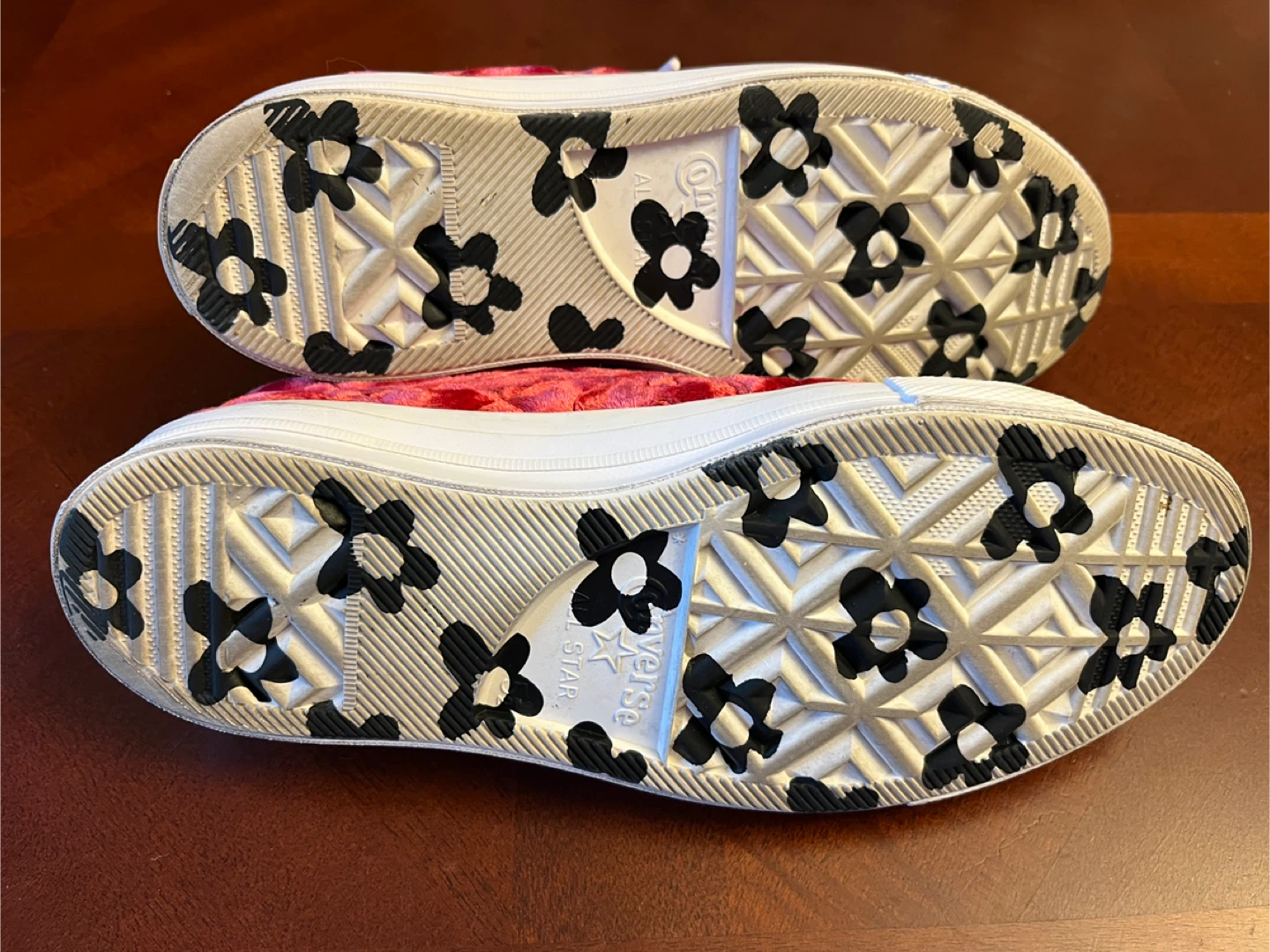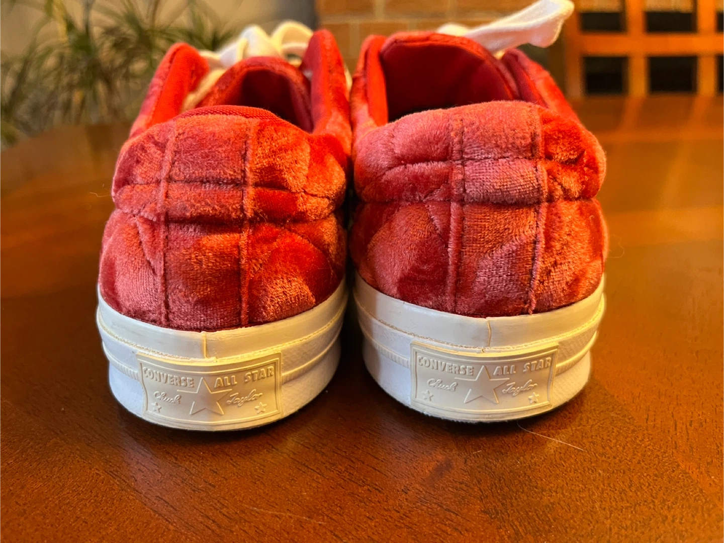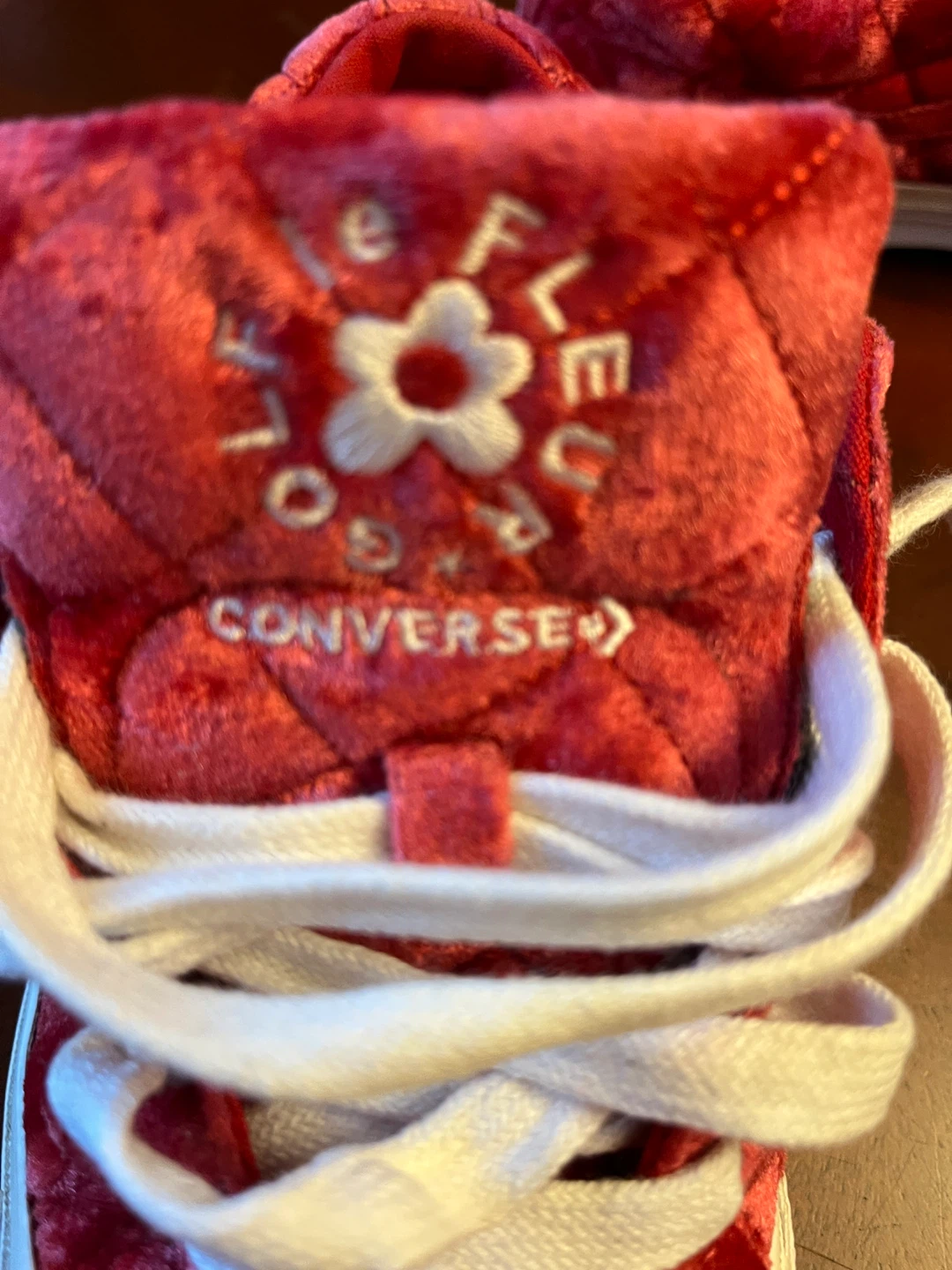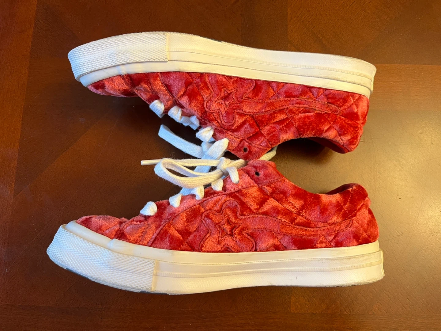 Converse Golf Le Fleur x One Star sneakers in the ‘Quilted Velvet Cherry’ colourway: a 2019 collaboration with Tyler, the Creator. Soft quilted velvet upper, white sole and floral branding details. Excellent condition with minimal wear; clean and from a smoke-free home.
