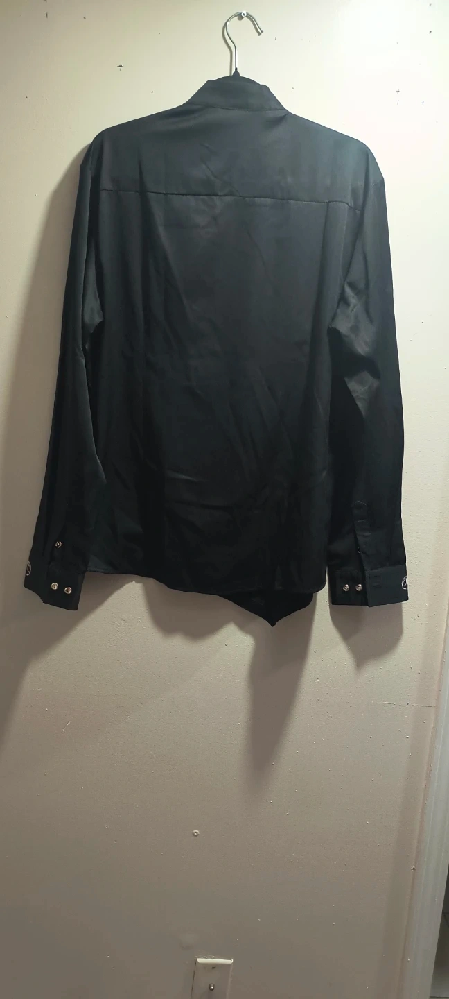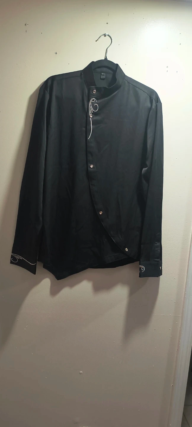 90Selling a black dress shirt. It's in great condition and would be perfect for any formal occasion. The shirt has a unique asymmetrical button design and stylish details on the cuffs