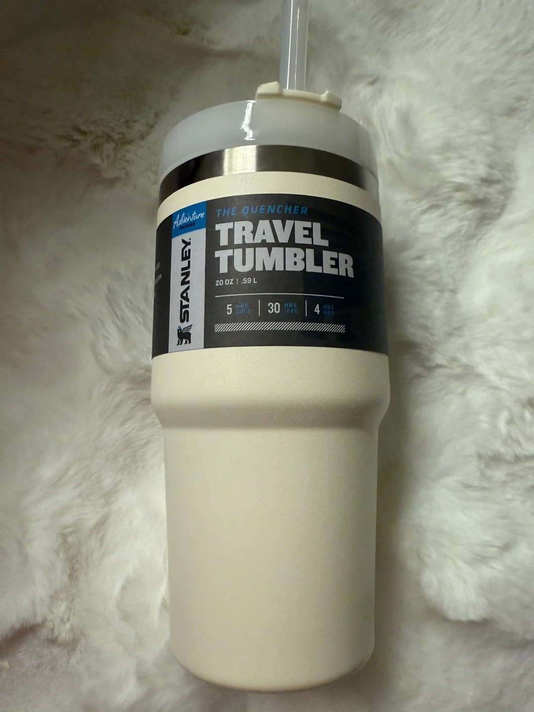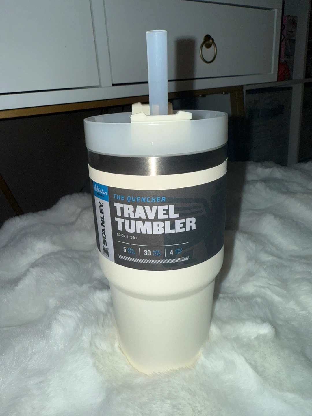 60Stanley Adventure The Quencher Travel Tumbler, 20 oz size! This tumbler features 18/8 stainless steel and is BPA-free. It also has double-wall vacuum insulation and a screw on 3-position lid. It comes with a reusable straw and is dishwasher safe!