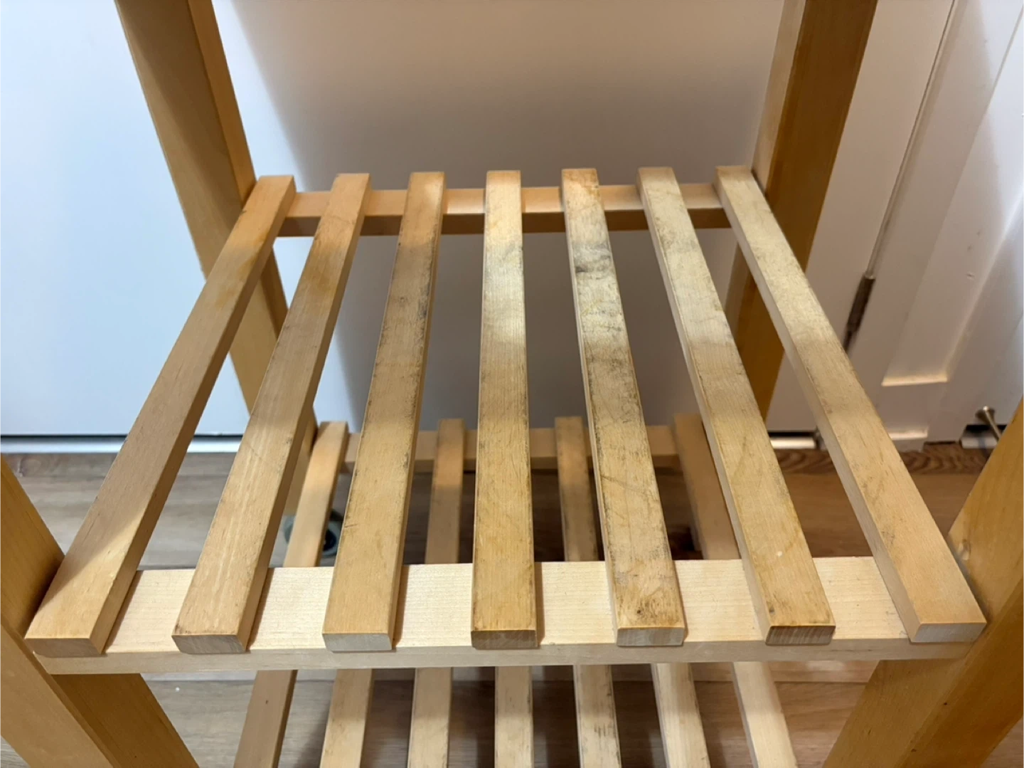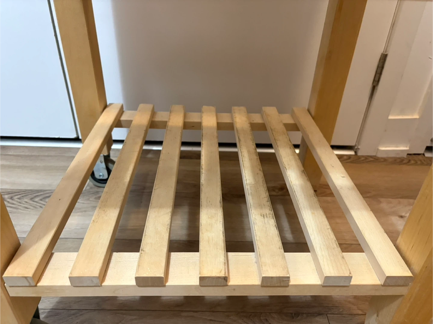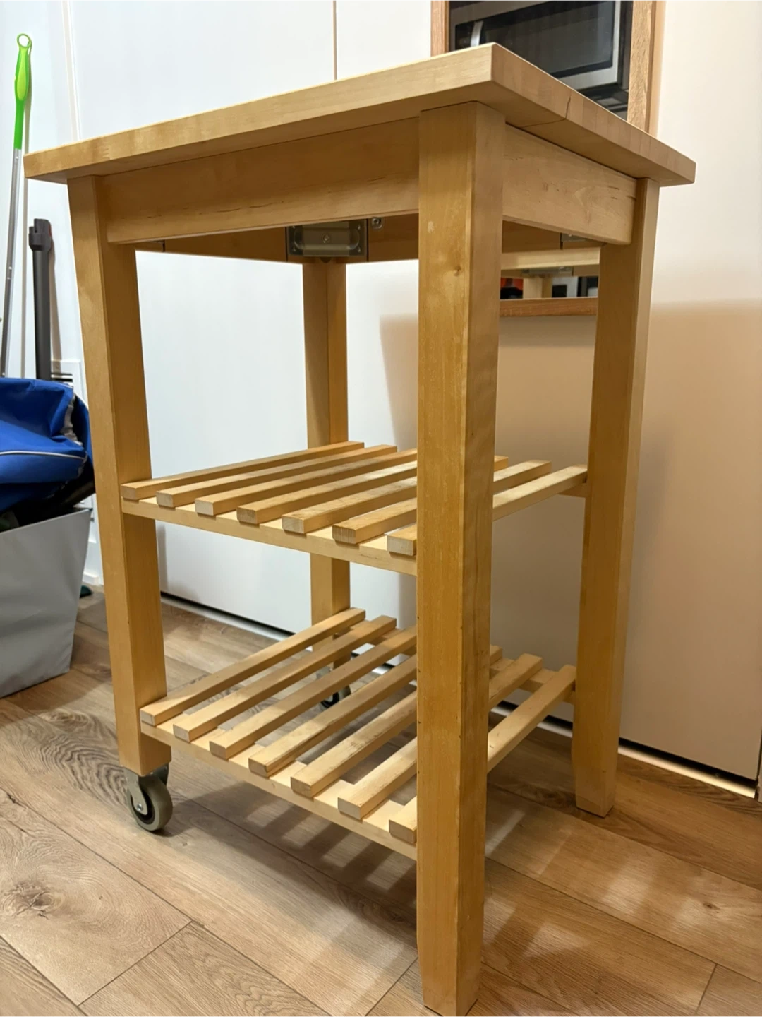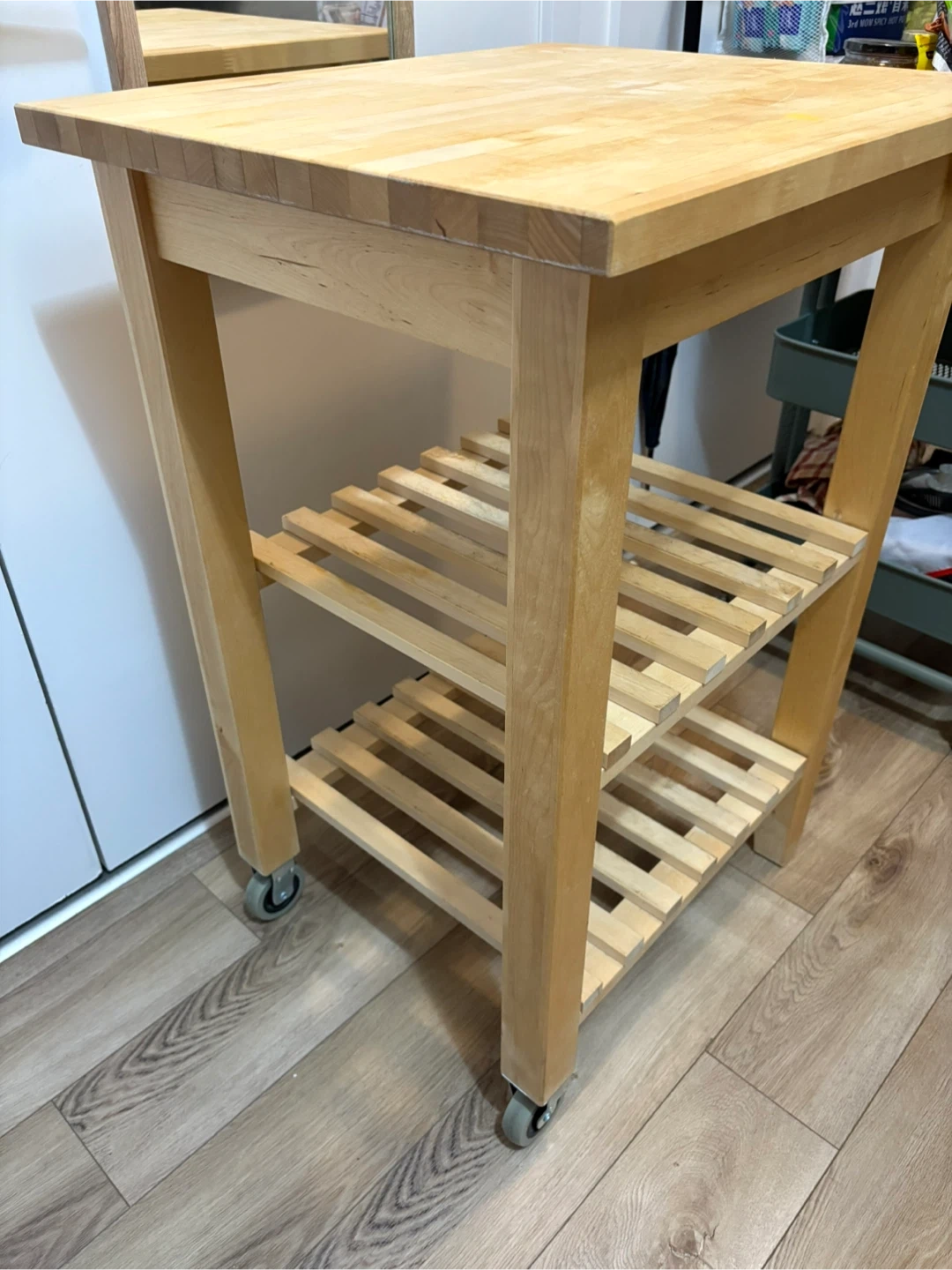 10Solid wood kitchen island with two slatted shelves and smooth-rolling caster wheels. Perfect for extra kitchen storage, plant stand, or as a movable prep station. Well maintained, sturdy and clean overall, only some marks from normal use (see photos). • Material: Solid birch wood • Dimensions: 58 cm (L) × 50 cm (W) × 85 cm (H) • Two-tier slatted shelves + solid top • Wheels move smoothly 💰 Asking: $40 📍 Pickup: Finch and Warden