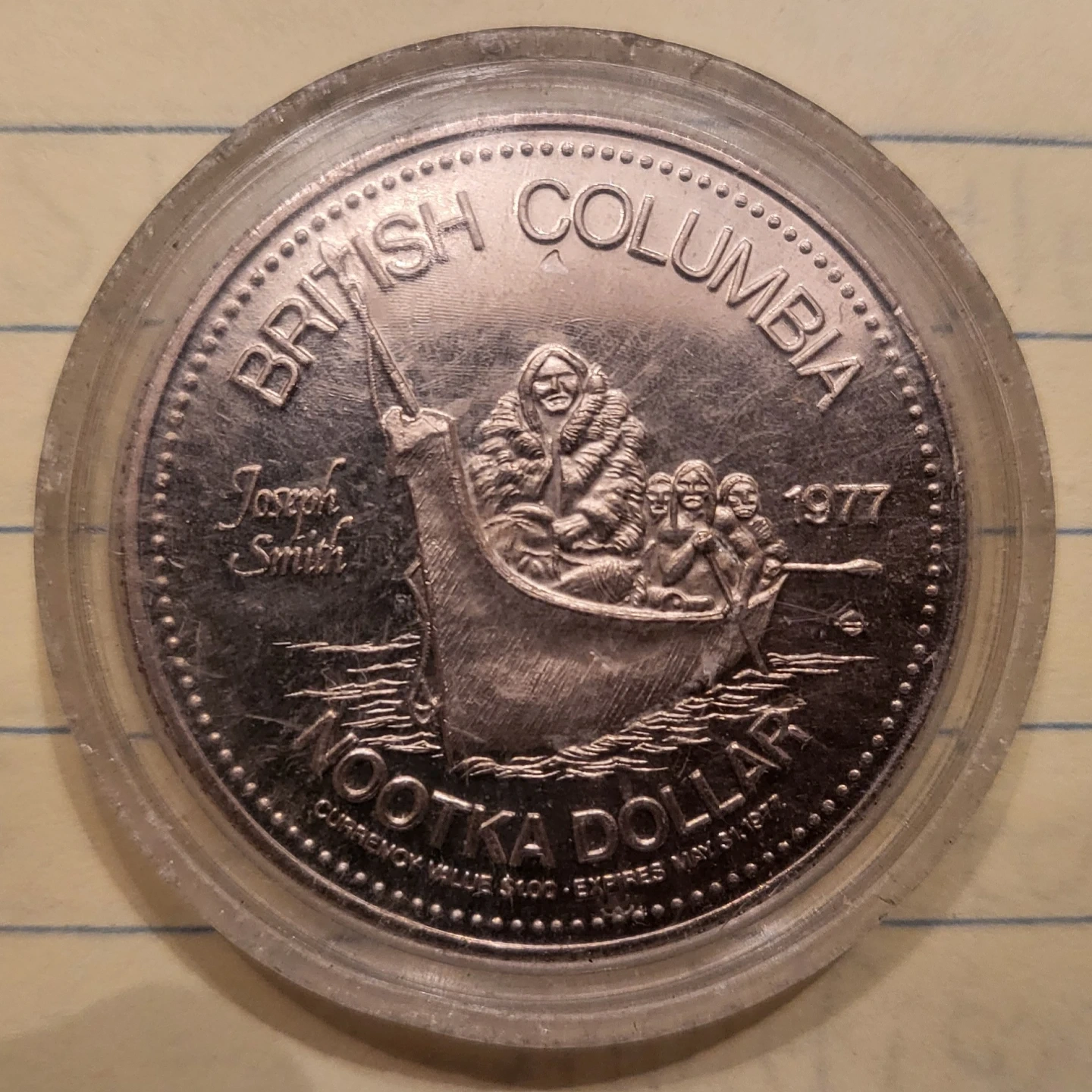 Selling a 1977 British Columbia Nootka Trade Dollar token. It features an image of Joseph Smith and a boat on one side, and Maquinna on the other.