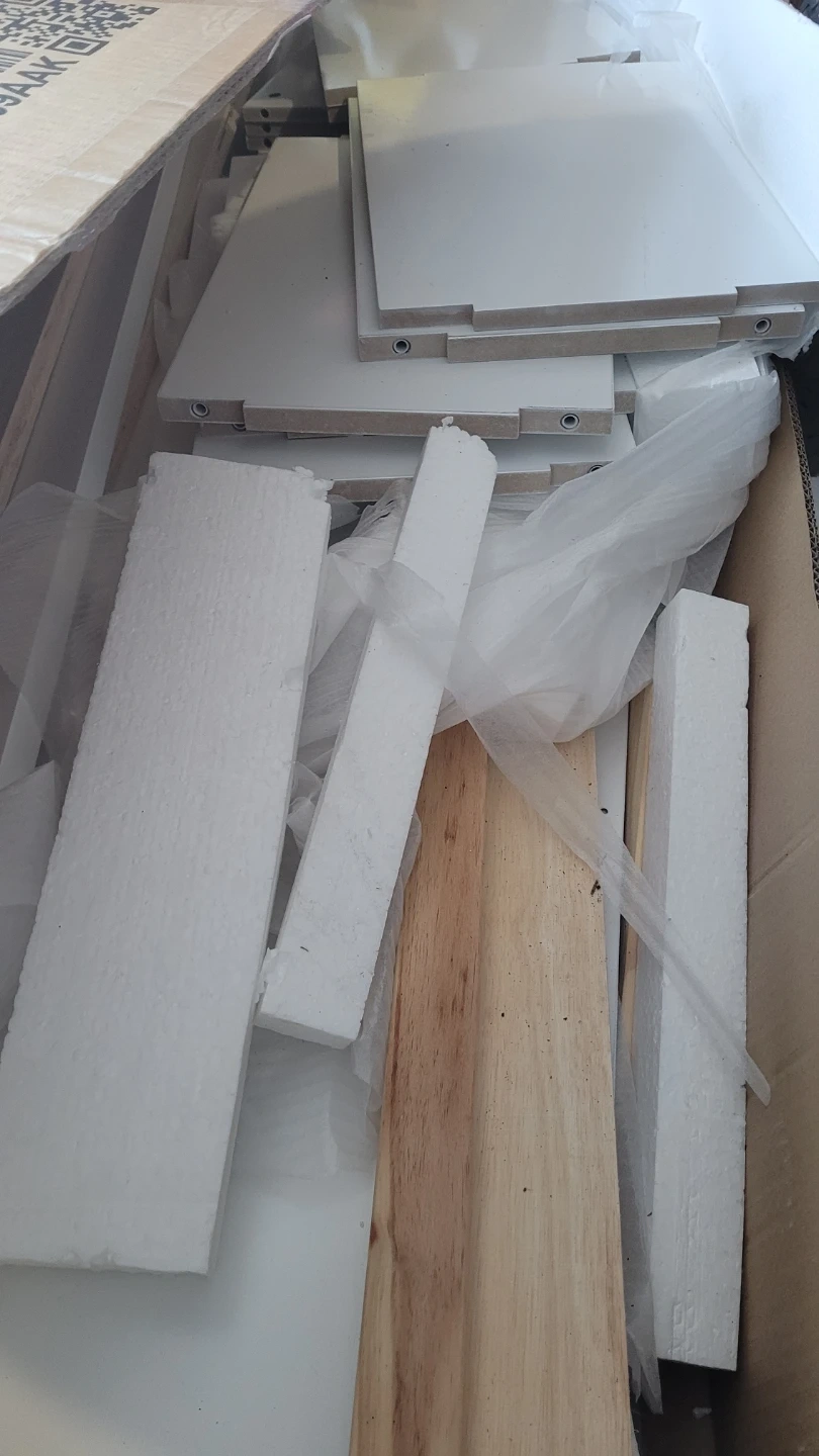 Free, brand new IKEA cabinet shelving parts. Never used. In white! It's still in its original packaging, so you'll have to assemble it yourself. Perfect for DIY shelving. Part of bed frame shelving, that was not used.