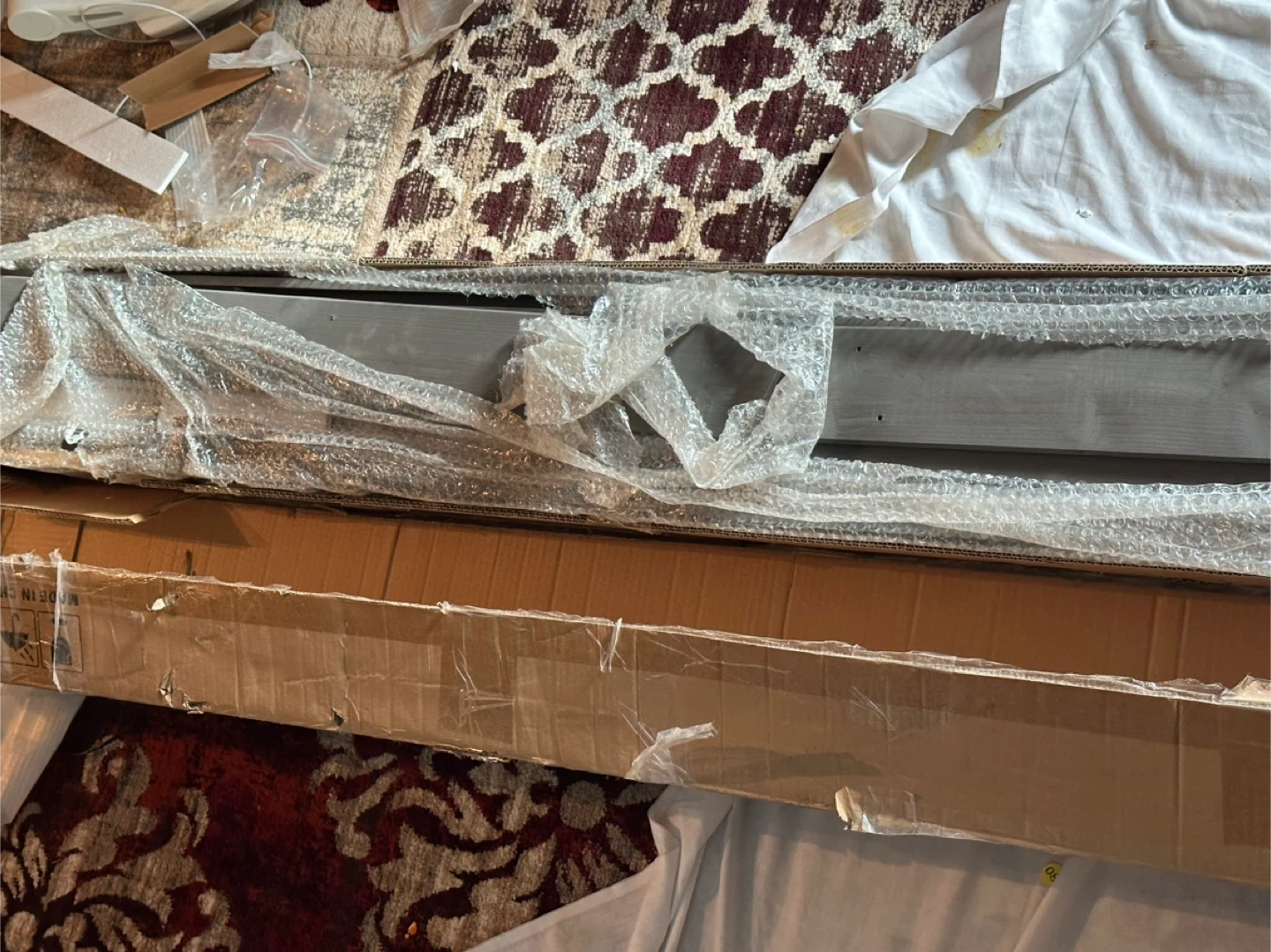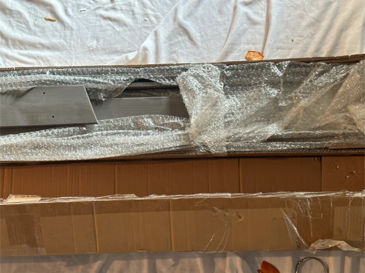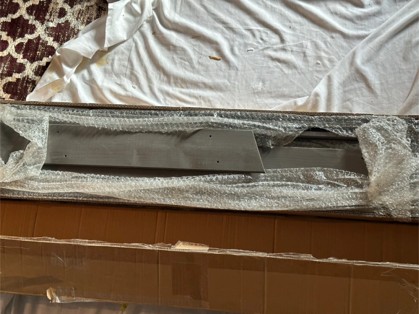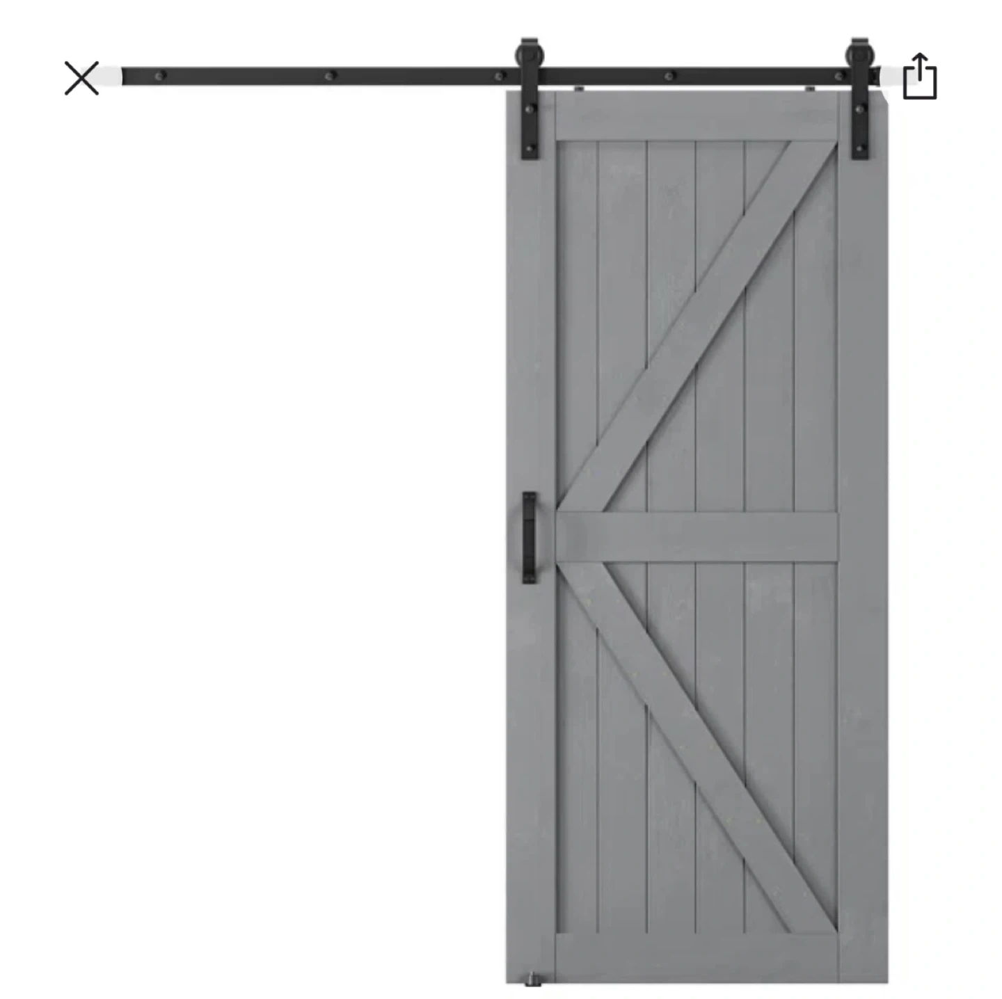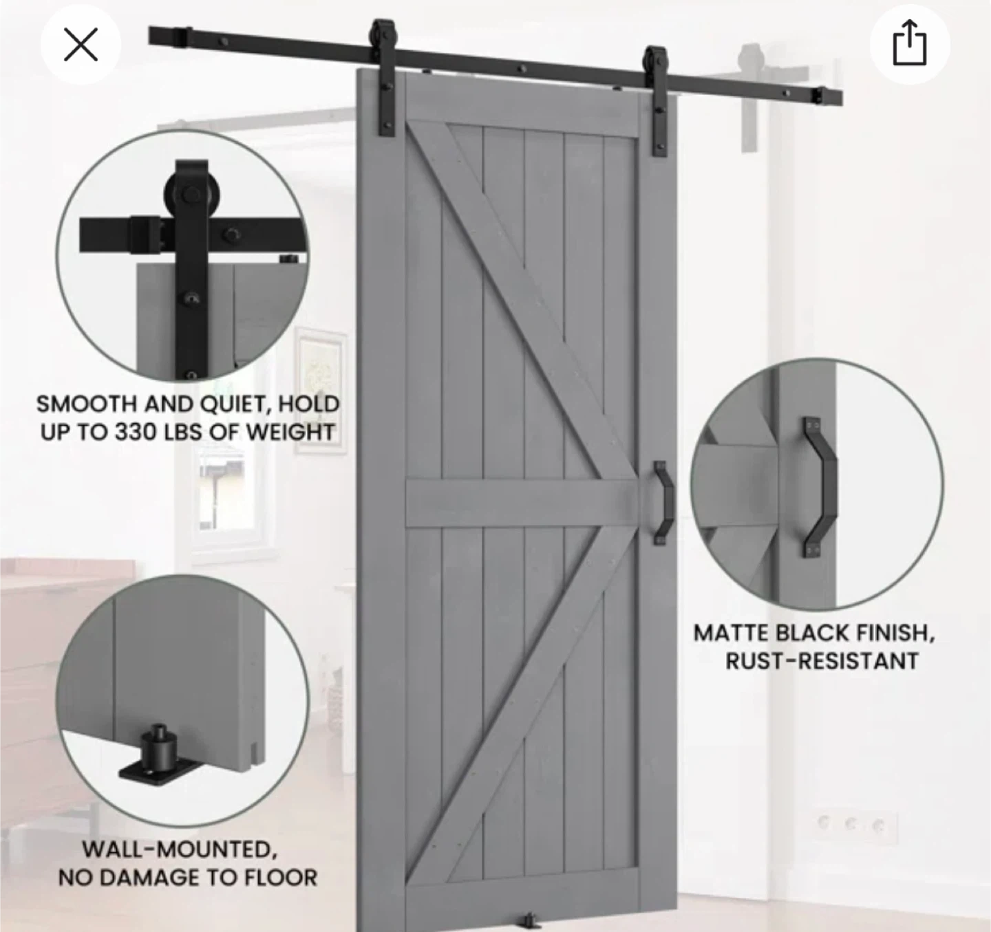 Selling an 84-inch panelled solid wood finished barn door from LDB Building! It comes with an installation hardware kit. The door is grey and features a matte black finish that is rust-resistant. It's designed for smooth and quiet operation, and can hold up to 330 lbs of weight. The door is wall-mounted, so it won't damage your