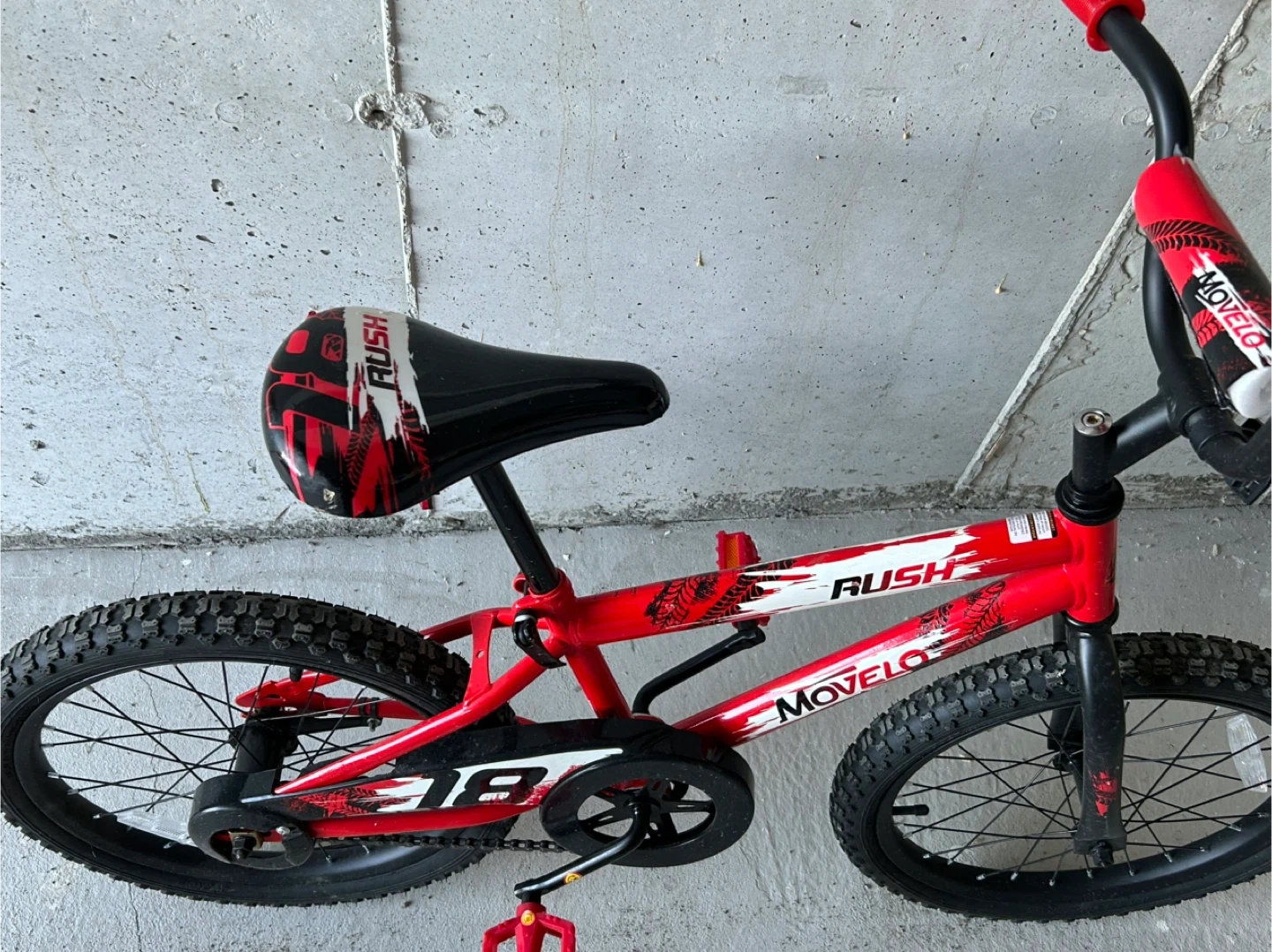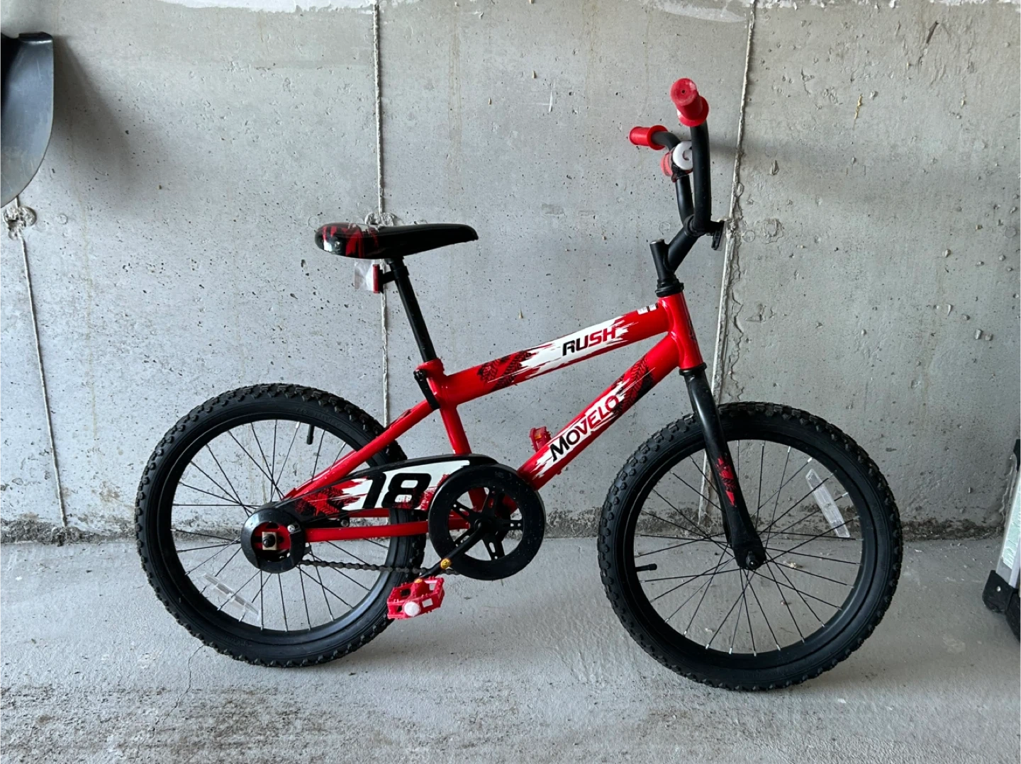 Selling a Movelo Rush kids bike in red! It's an 18-inch bike, perfect for young riders ready for some fun adventures. Ideal for ages 8-11. My son only used for one season.