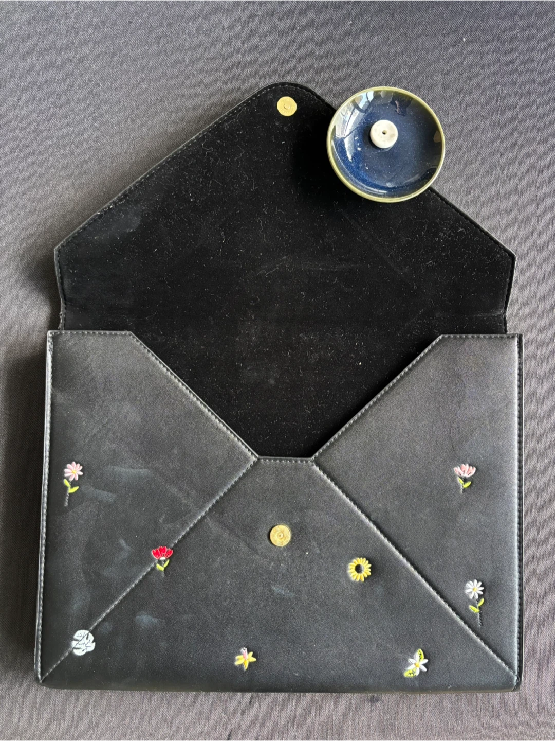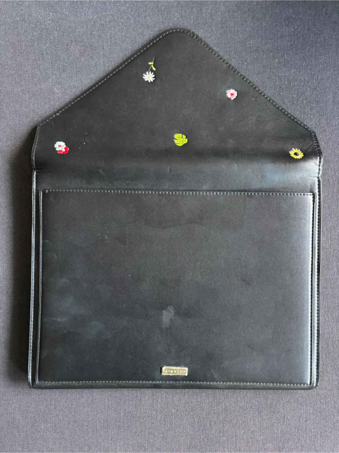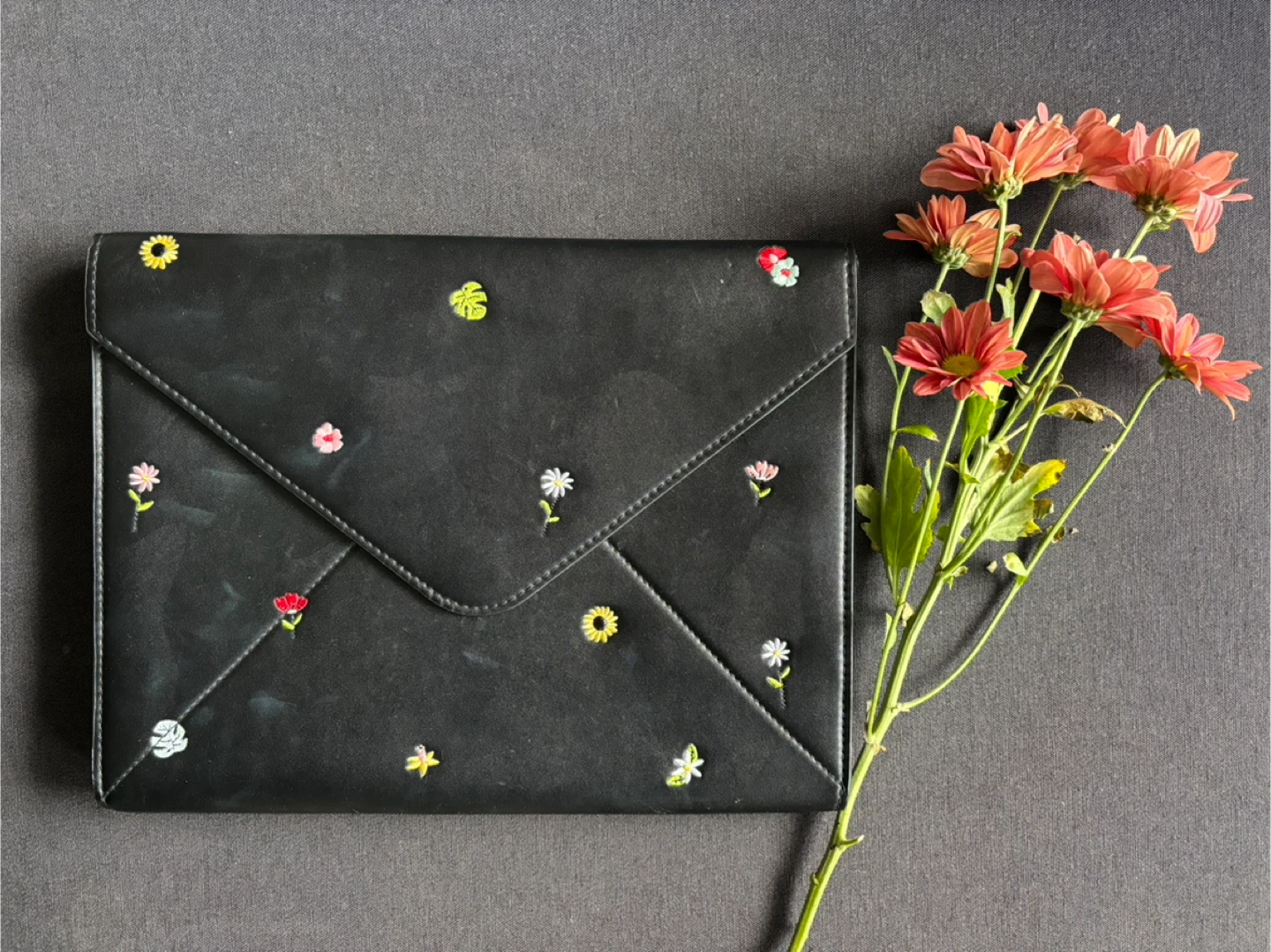 Selling a cute black laptop sleeve! It features a unique envelope-style design with delicate floral embroidery. Velvet inner lining, click on enclosure, with a back pocket. Perfect for 13 inch laptop
