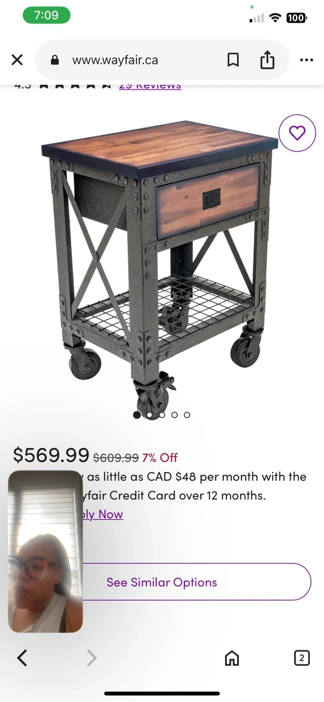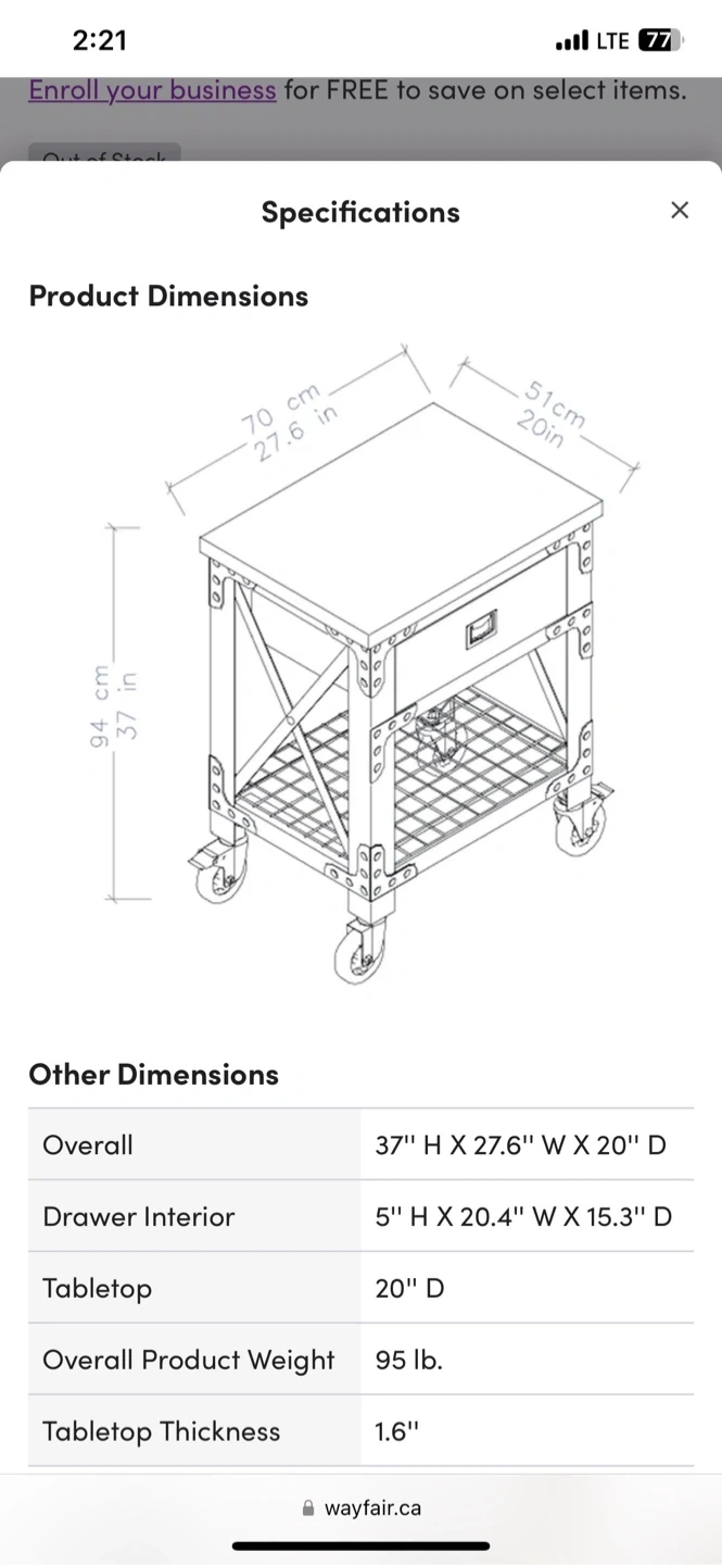 This industrial-style rolling kitchen cart is perfect for adding some rustic charm to your space! It features a wooden top and drawer, with a metal frame and wheels. The cart is in great condition and ready to roll into your home. Dimensions are 37" H x 27.6" W x 20" D. Originally for $569.99