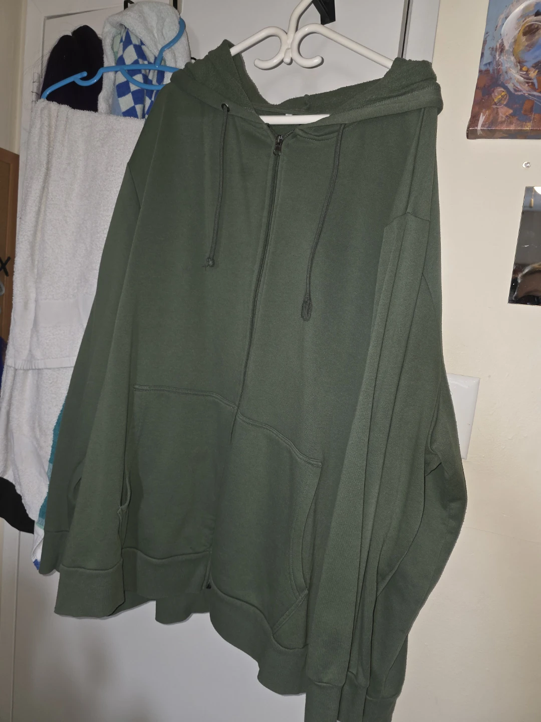 Selling a comfy green zip-up hoodie! It's in good condition and perfect for layering or just lounging around. It features a hood and front pockets for extra convenience. A simple and practical addition to your wardrobe! Size 5x.