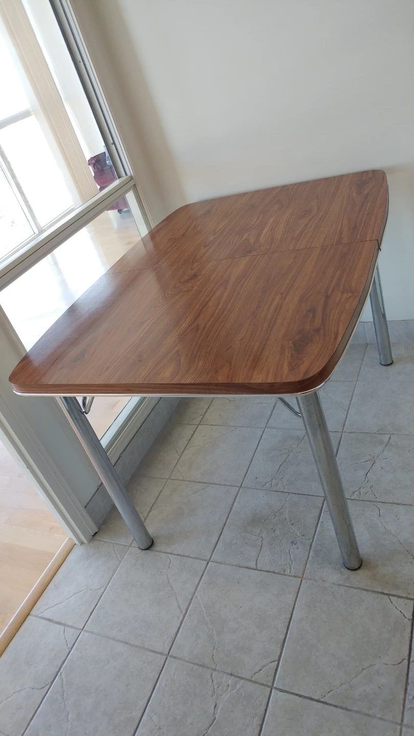Selling a kitchen table with a wood-look top and silver legs! It looks like it can be extended, which is great for when you have company over.
