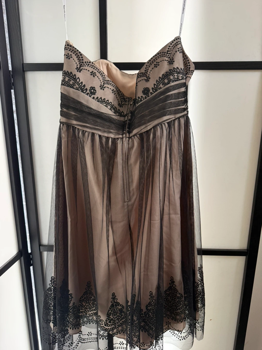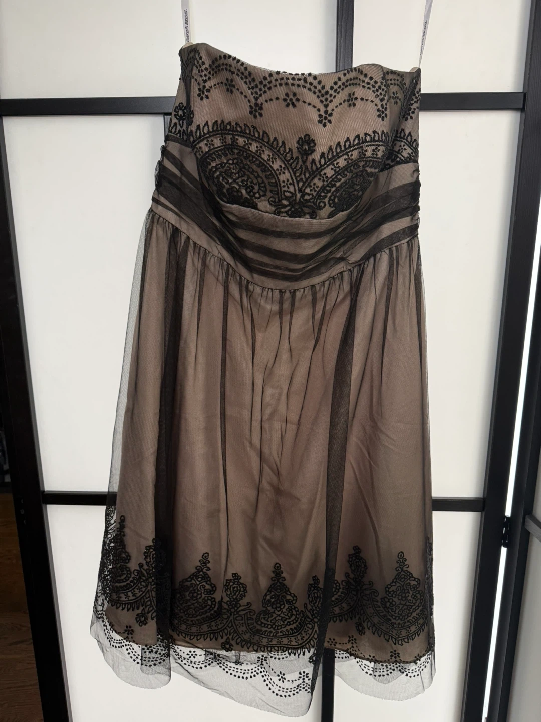 Selling a strapless dress with a black and beige color scheme! The dress features a black lace design on the top and bottom, with a beige underlay and black tulle overlay. It's in great condition and ready for a new home!